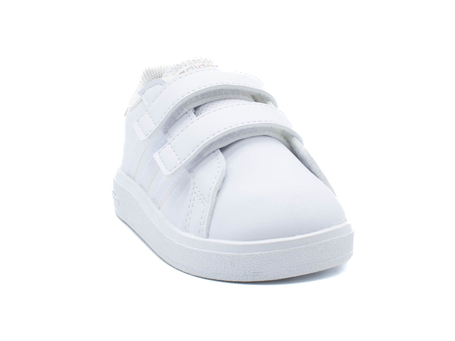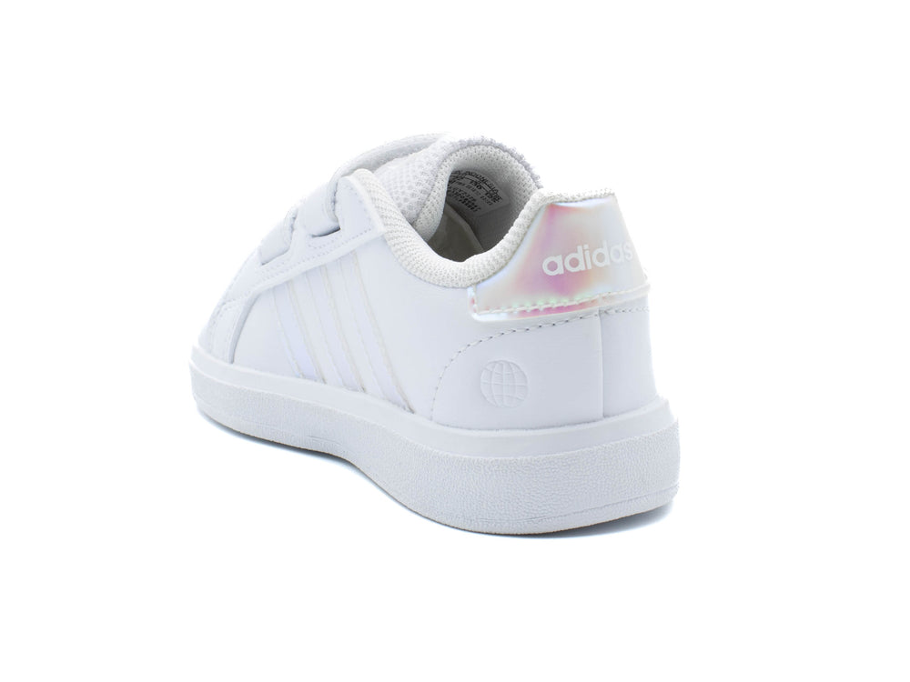 Dress your little one up in these oh-so cute unisex Grand Court 2.0 cloud white/iridescent/cloud white sneakers by Adidas. Made of synthetic leather upper containing at least 50% recycled content, these classic athletic sneakers showcase a round toe and twin adjustable hook-and-loop straps closure for custom fitting and easy on/off wear. Iridescent 3-Stripes detail at the quarter Adidas branding at the heel counter add iconic sporty vibes. Features include breathable textile lining, increased forefoot flexibility, and a durable rubber outsole with honeycomb patterned tread.