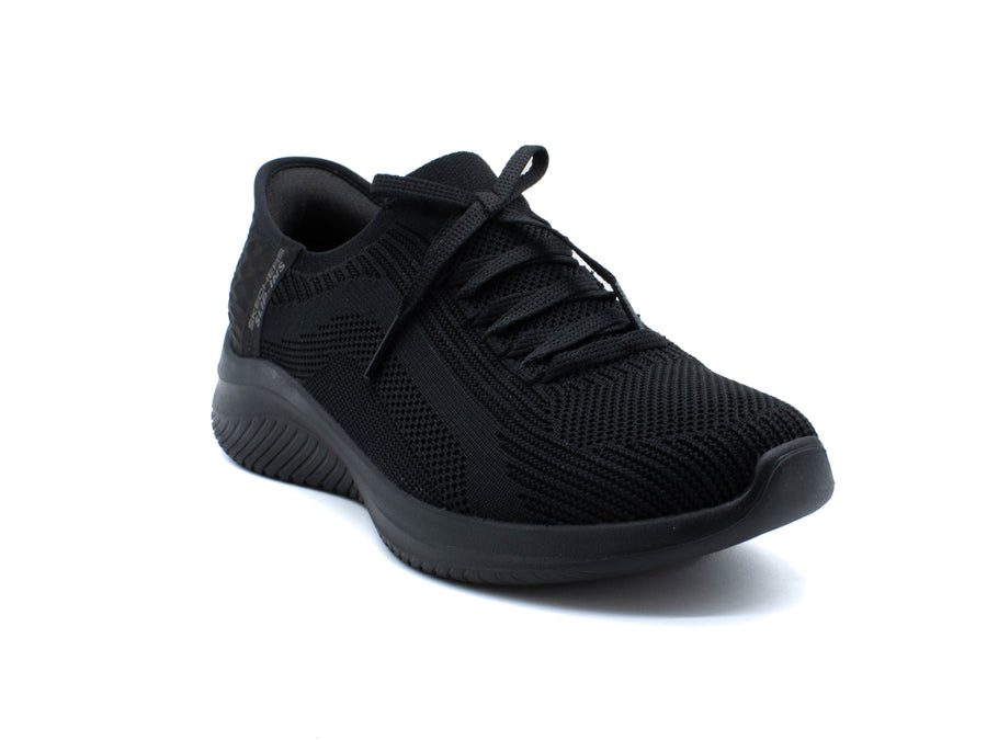 Step into easy-wearing comfort with Hands Free Slip-Ins Ultra Flex 3.0 Brilliant Path black/black sneaker from Skechers. This sneaker is designed with a unique Comfort Pillow in the heel. This style also features a Stretch Fit engineered knit upper with a cushioned Skechers Air-Cooled Memory Foam insole. Flexible outsole with flexible traction design.