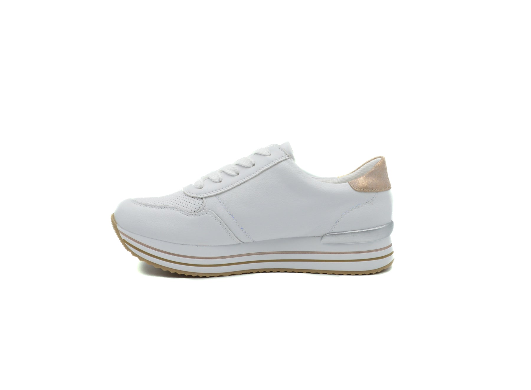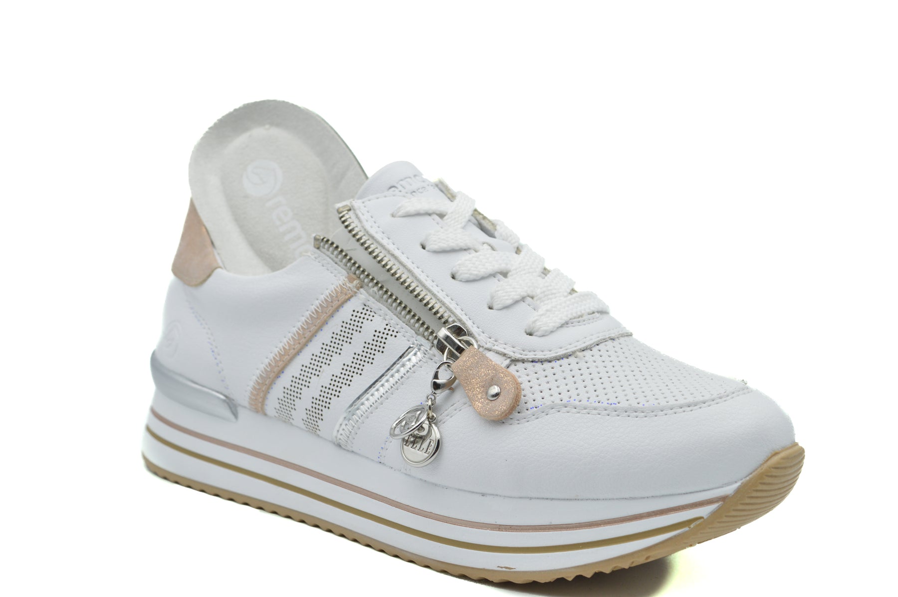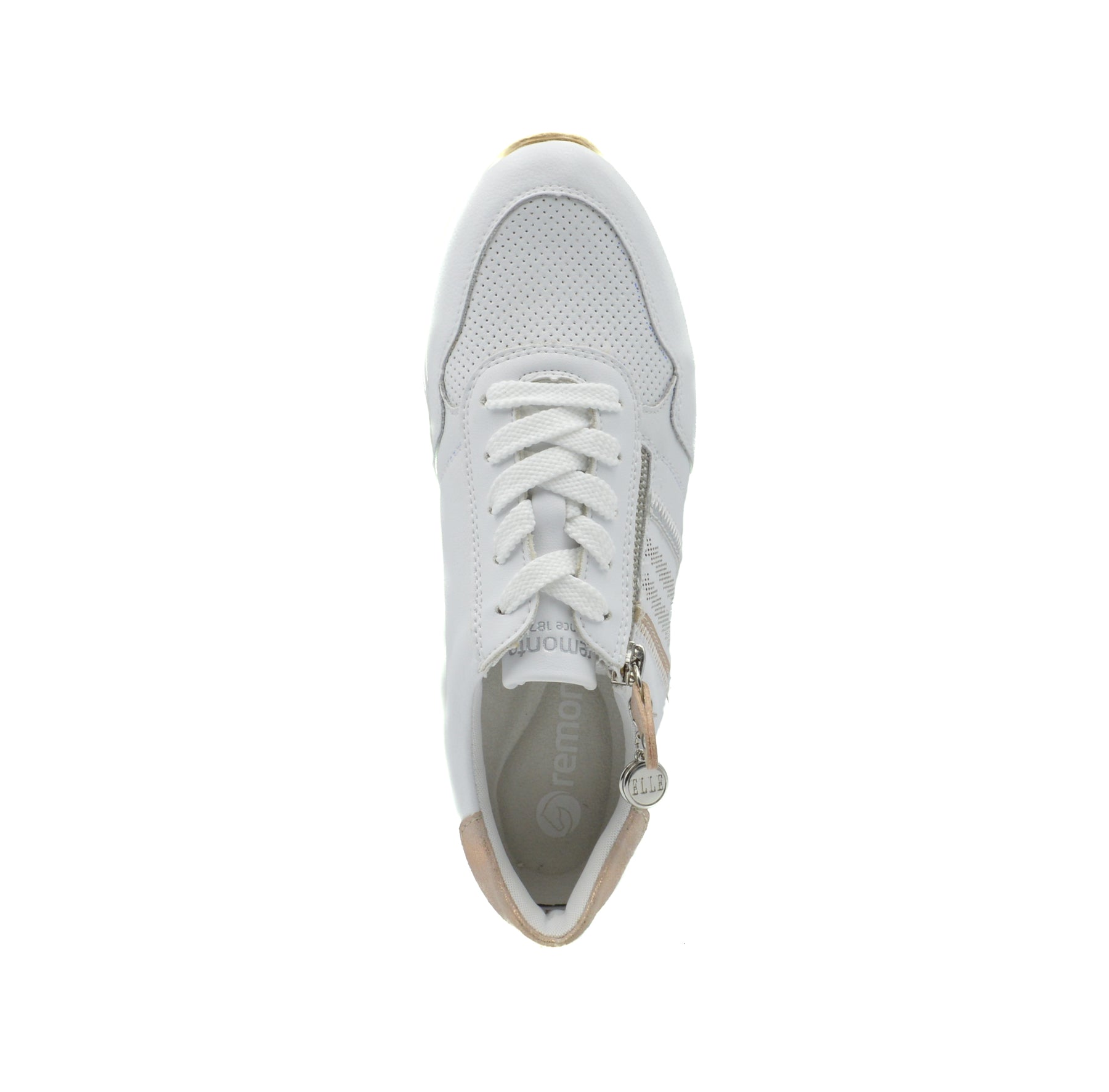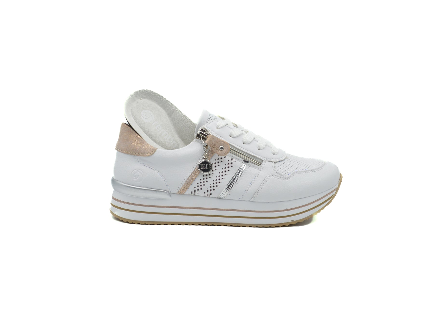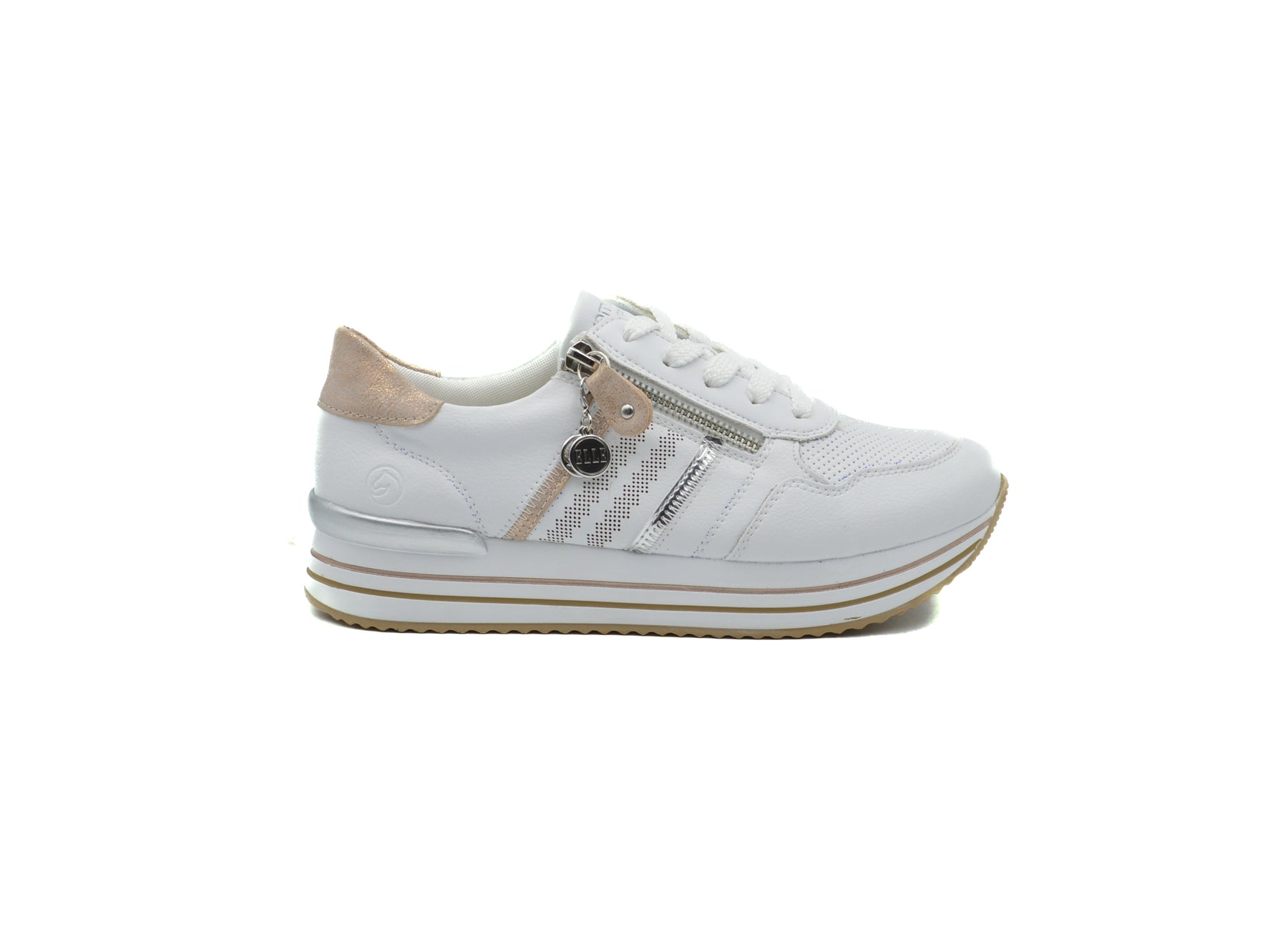 Dress white combo summer sneakers in soft leather and cushioning insole. Closure laces and side zipper. Insole is removable to fit orthotics. Style shown in Elle magazine.