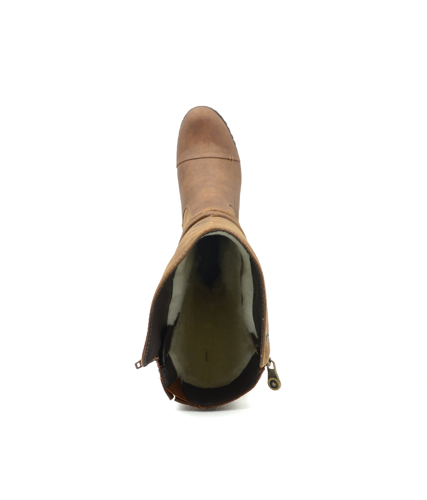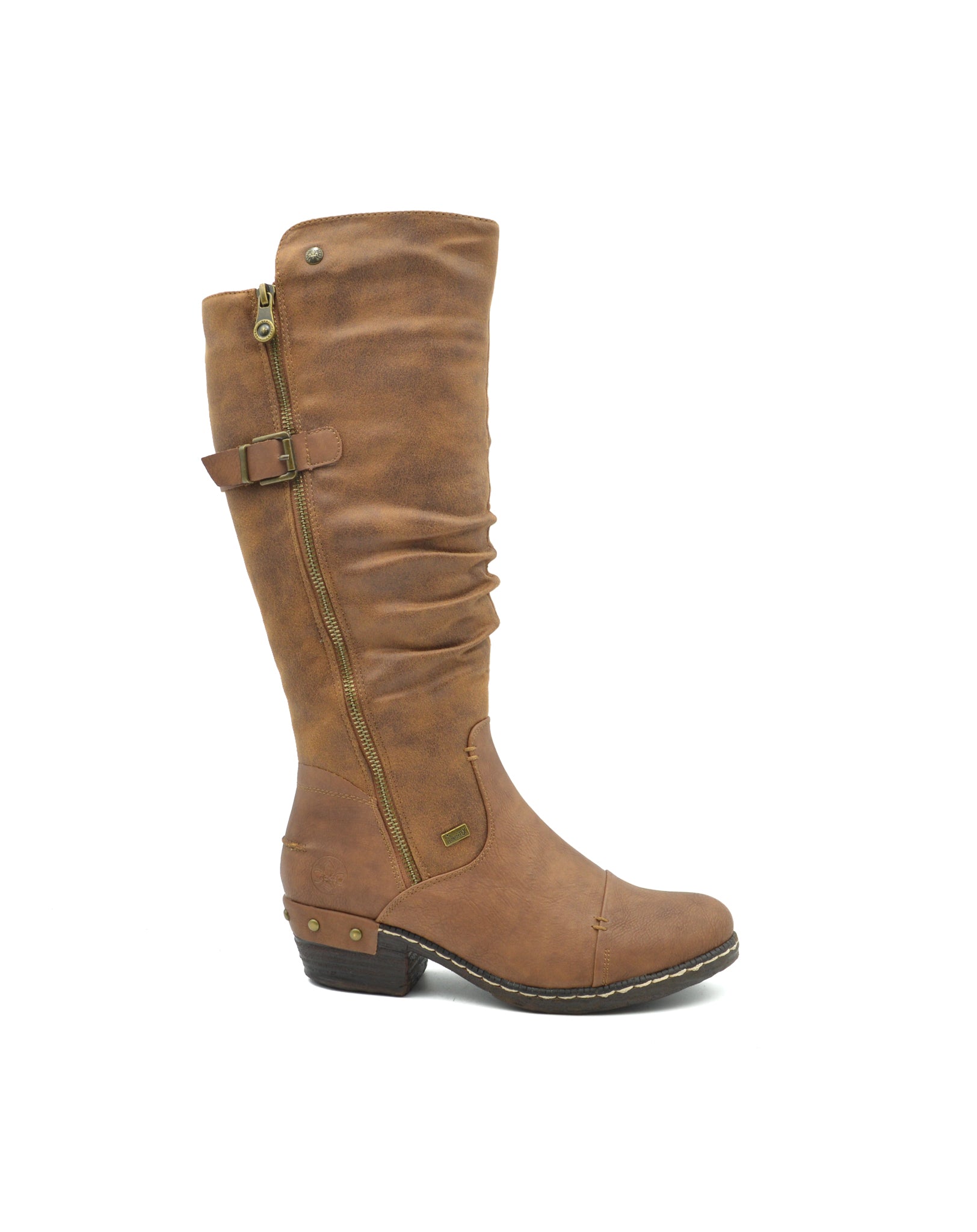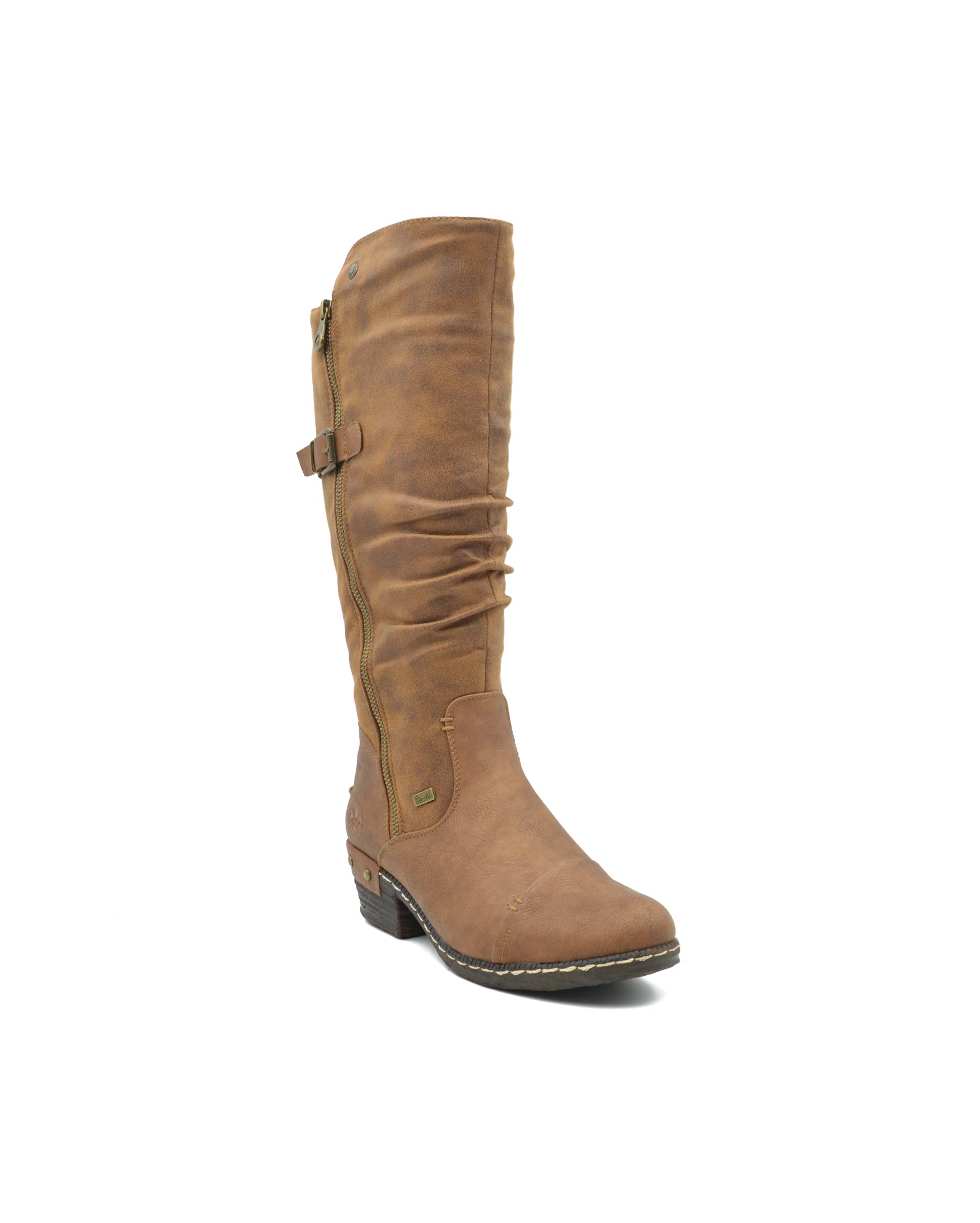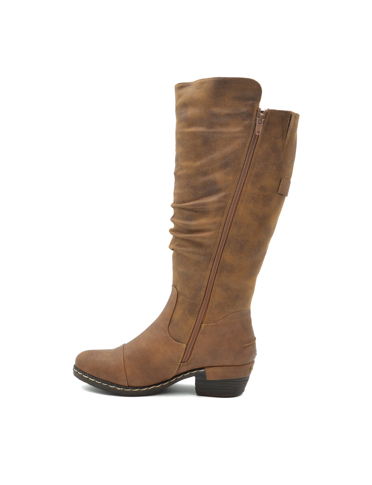 These slouchy women's knee-high boots feature a long zip closure with a small block heel. Ruched suede and a rich tan colour make these boots perfect for chilly weather.