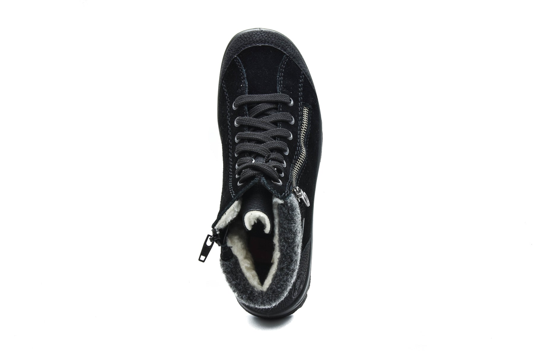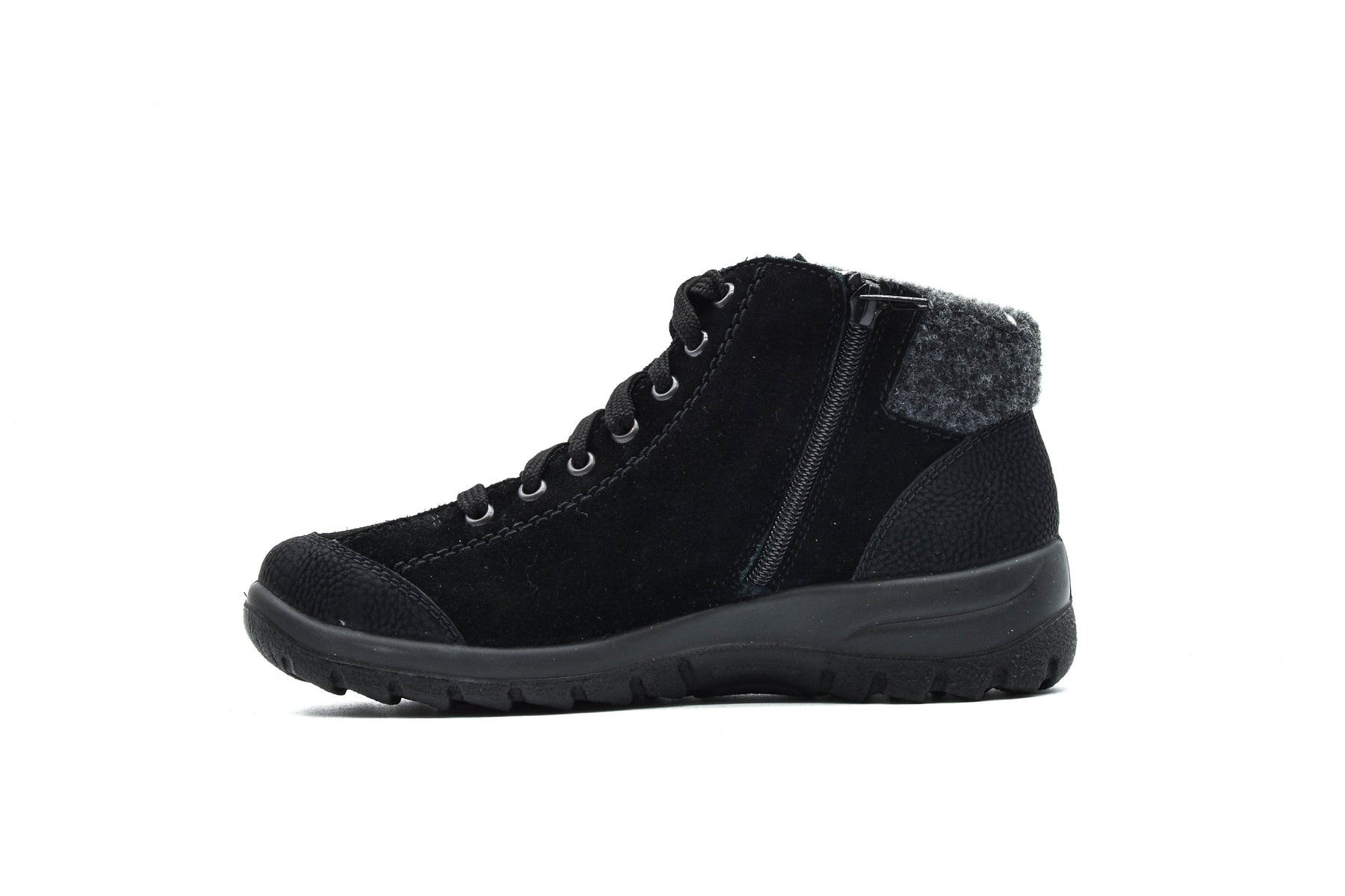 These confident, black women's lace-up boot by RIEKER is wonderfully comfortable thanks to the flexible outsole and the warm lining made of cuddly textile fleece. Together with the high shaft and the lacing of the boot you have optimal hold, while the zipper on the inside of the shoe allows you to put on the boot easily. Visual highlights of this boot are the beautiful decorative zipper and the felt collar on the shaft edge. The upper of the boot is made of a mix of genuine leather and imitation leather and is equipped with the RiekerTex™ membrane.