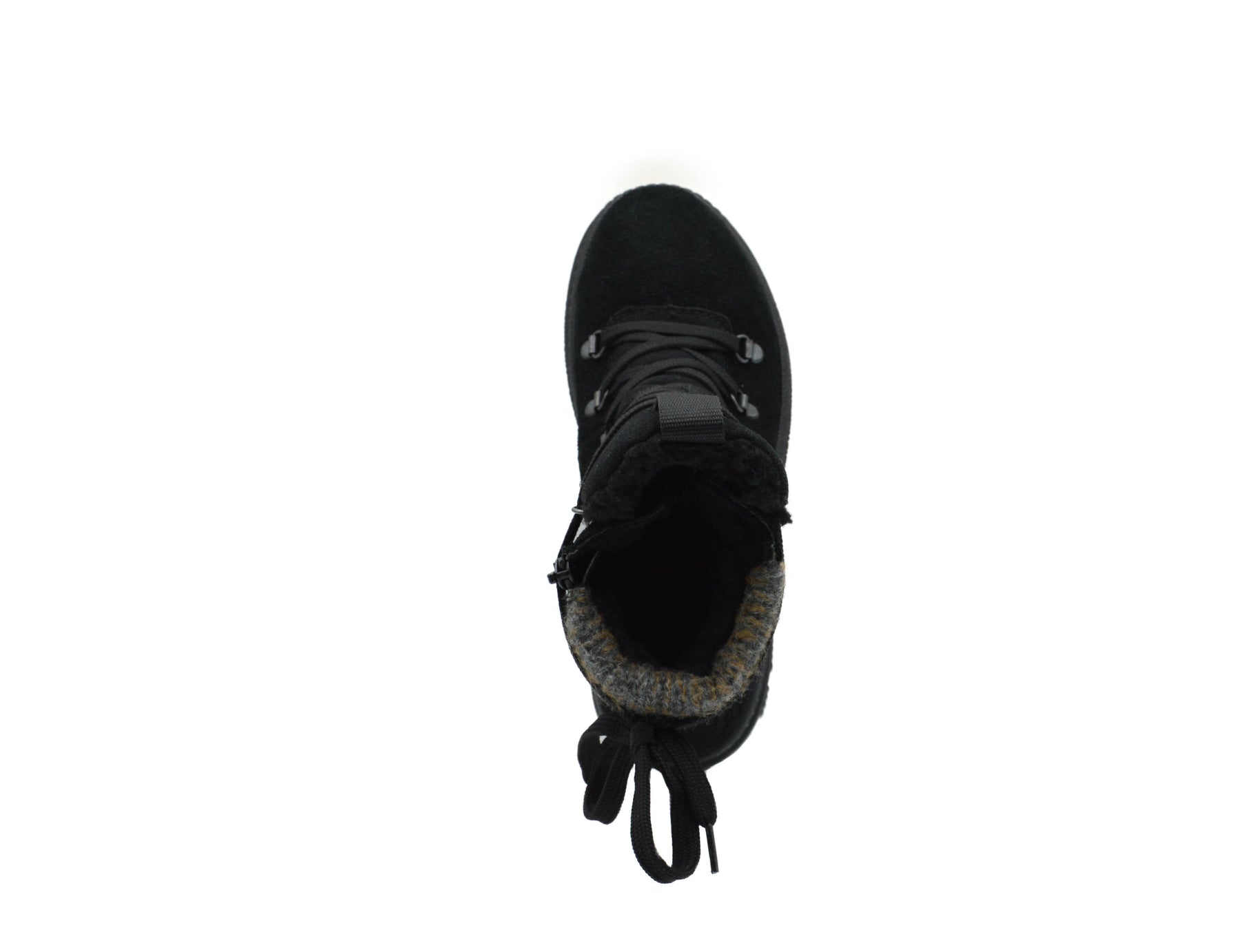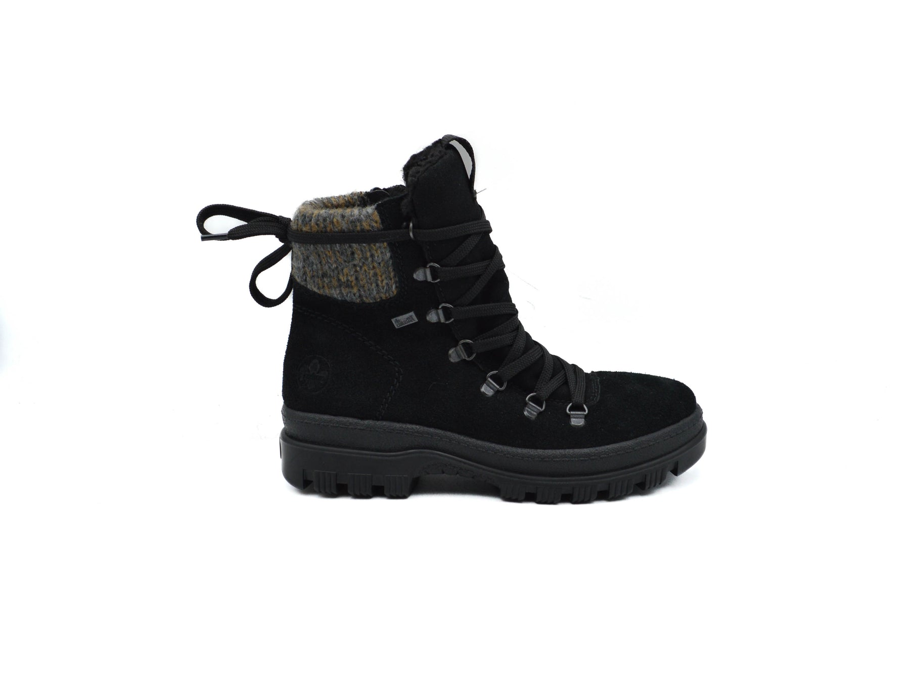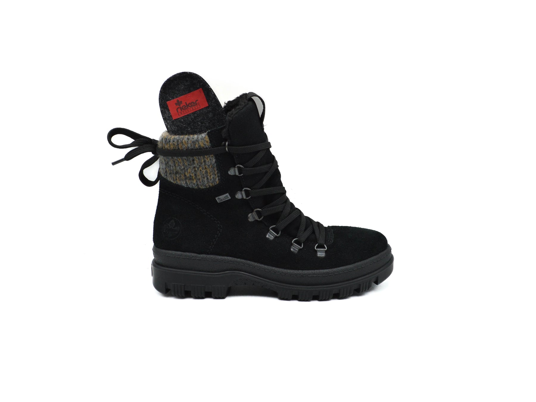 These night black lace-up boots made of suede leather have it all: comfort, function and, of course, style. The lacing complements the zipper and provides optimal support and perfect fit. The robust profile sole makes every step a safe affair. The lace-up boots are super comfortable thanks to the removable insole. The Flip-Grip technology equips the shoe with fold-out spikes for good grip on slippery surfaces and the water-repellent membrane offers optimal protection against wetness. Soft warm lining keeps the feet cozy and warm all day long. Fashionable wellness feeling in Rieker style!
