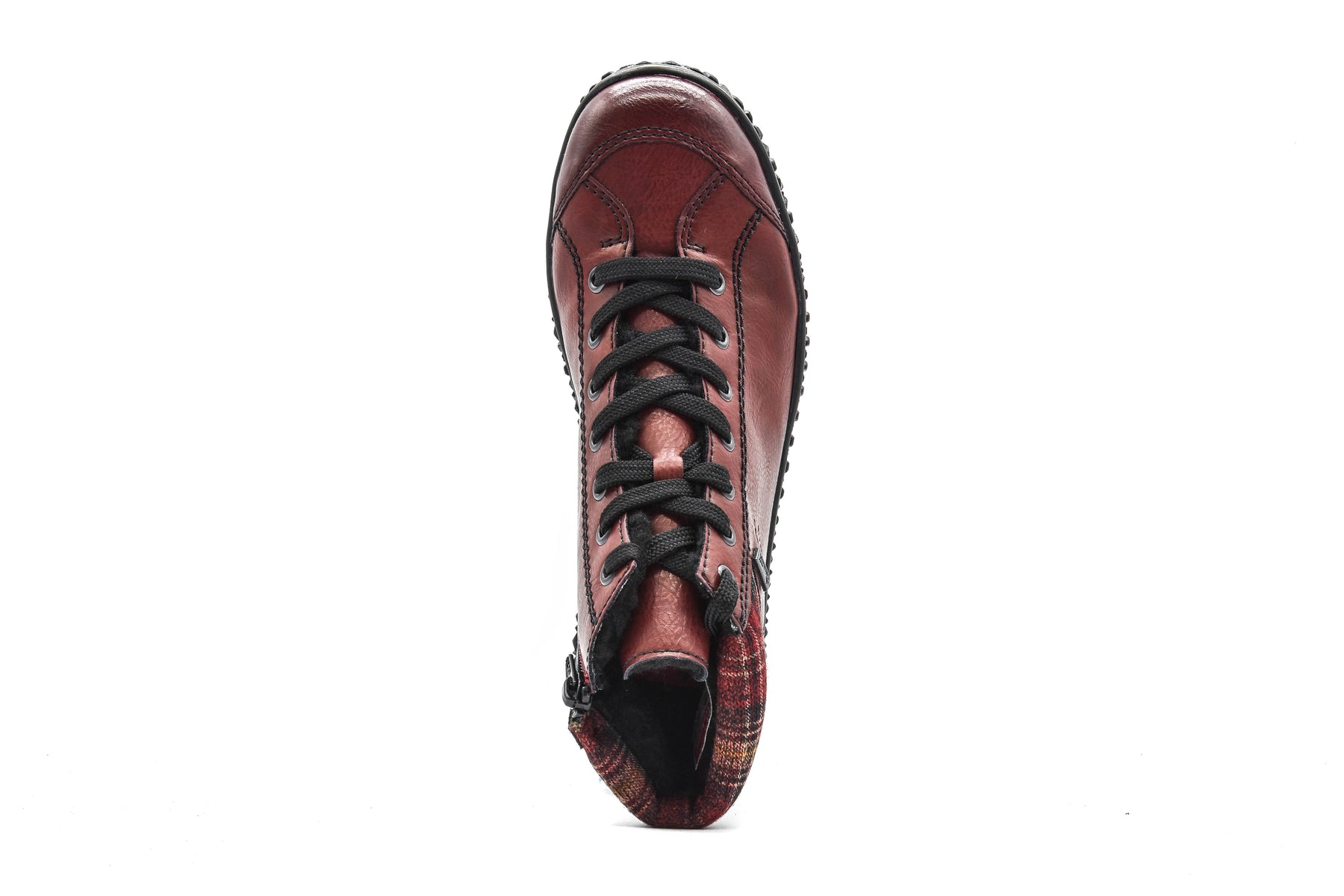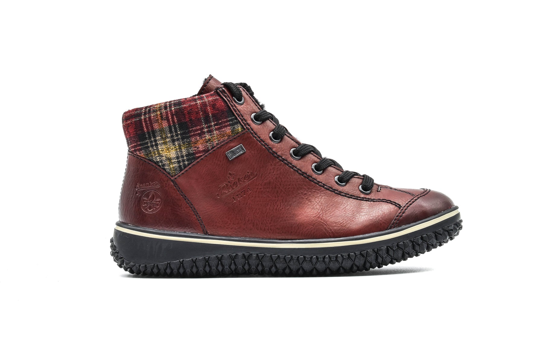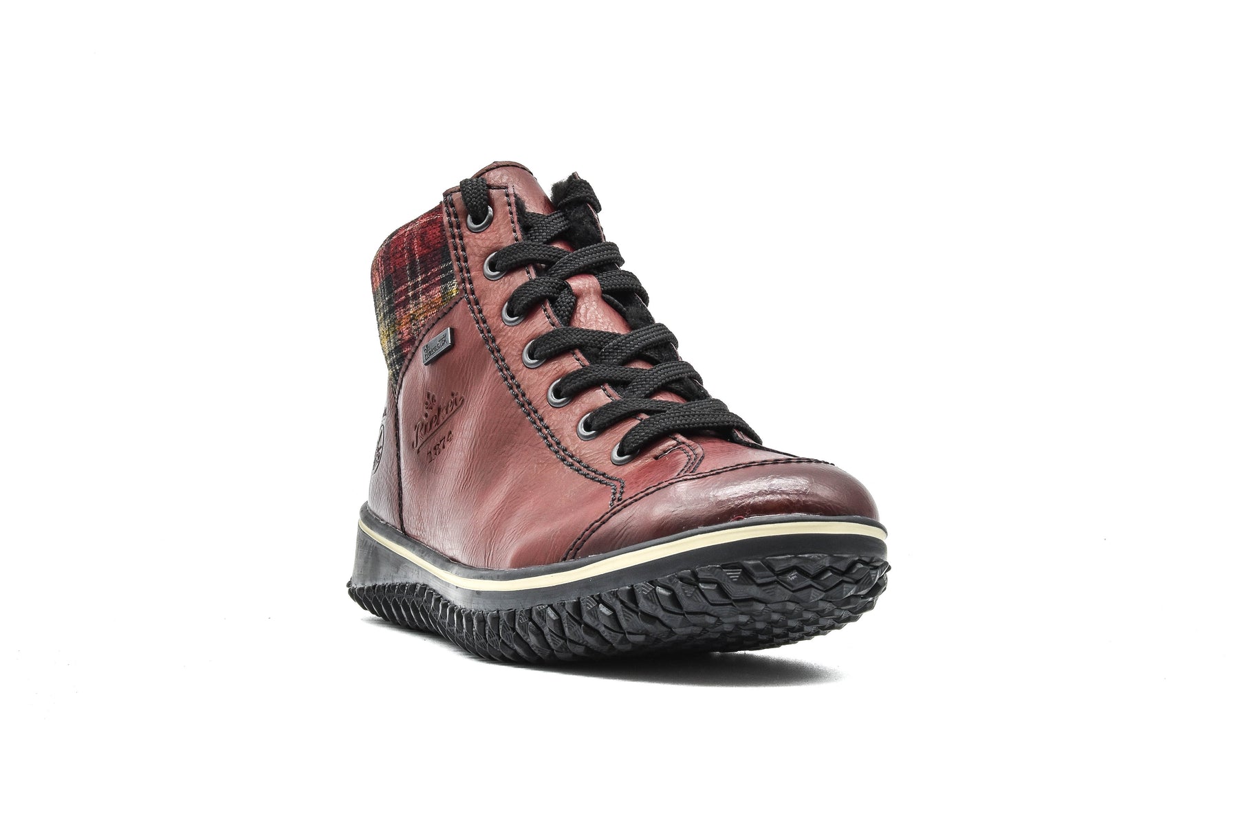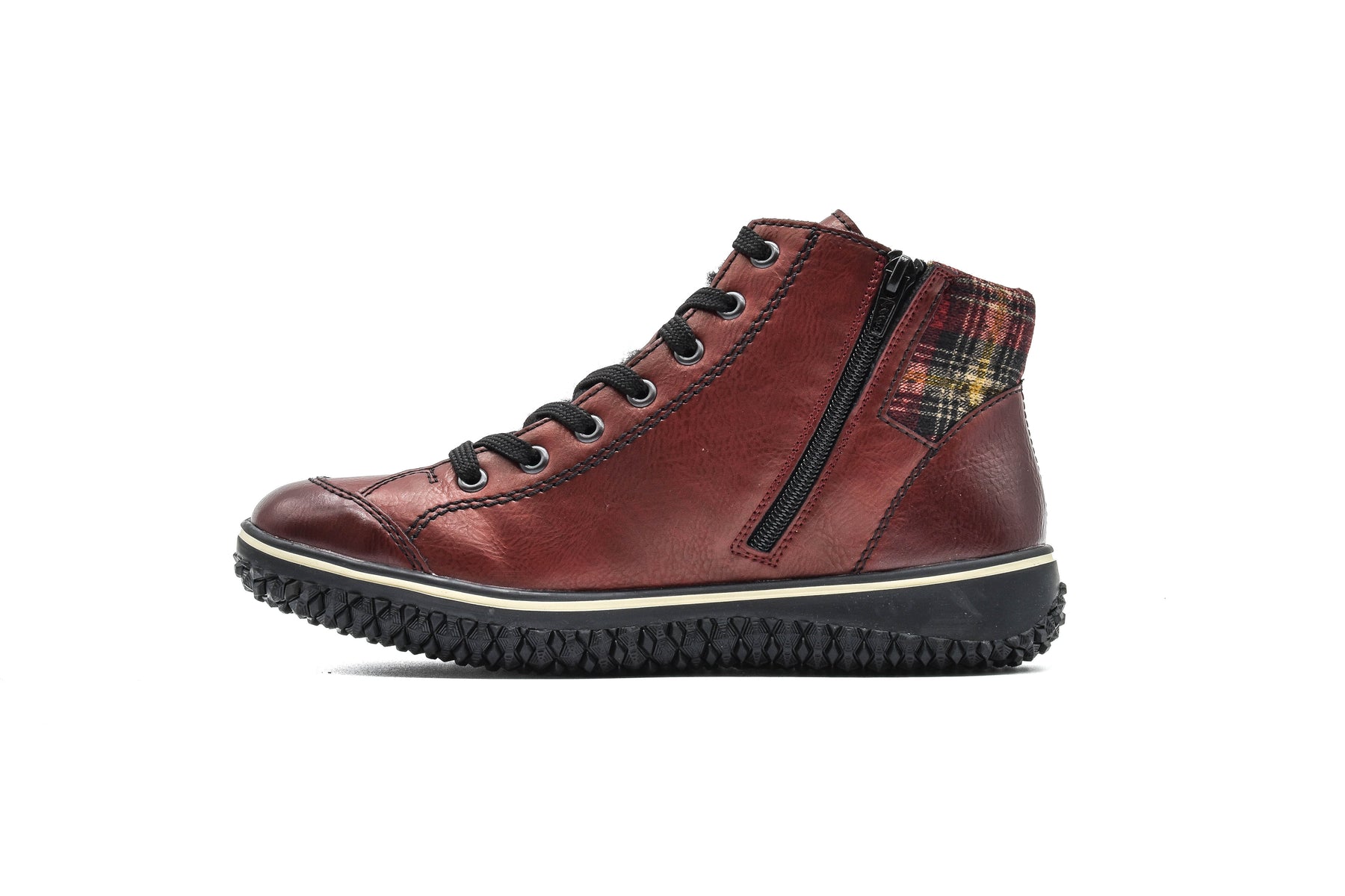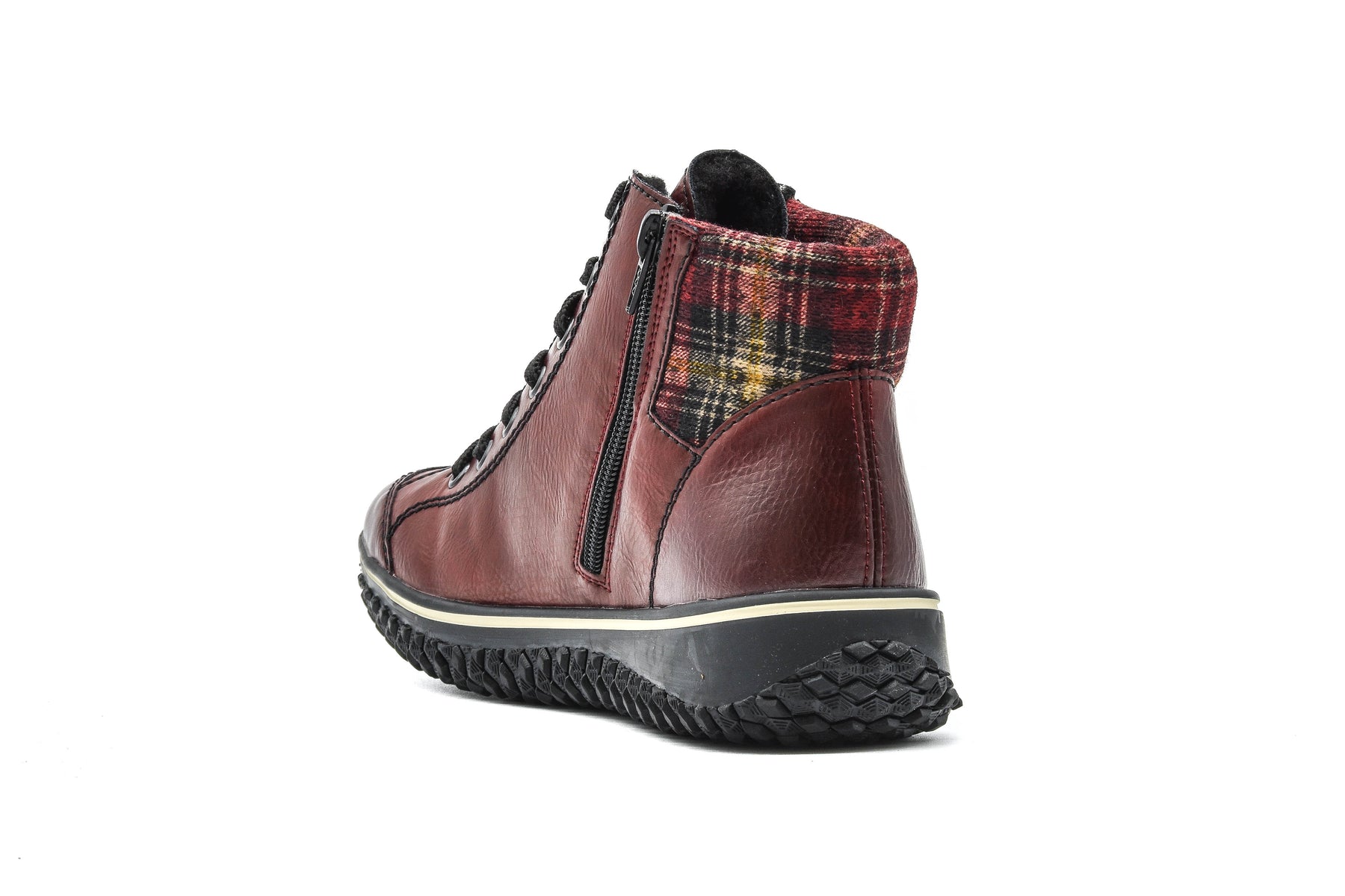 Red combination ankle boot with beige cuff. Rieker-Tex™ water-resistant technology.