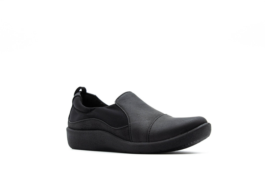 Step into the latest shoe from the Clarks Cloudsteppers Collection. The Sillian Paz in black synthetic nubuck has everything you look for in a Clarks comfort shoe: a soft fabric lining, a removable Clarks Cushion Soft™ with OrthoLite® footbed, and a lightweight, shock-absorbing EVA outsole. Choose this easy-going women's shoe for any activity that keeps you on your feet all day.