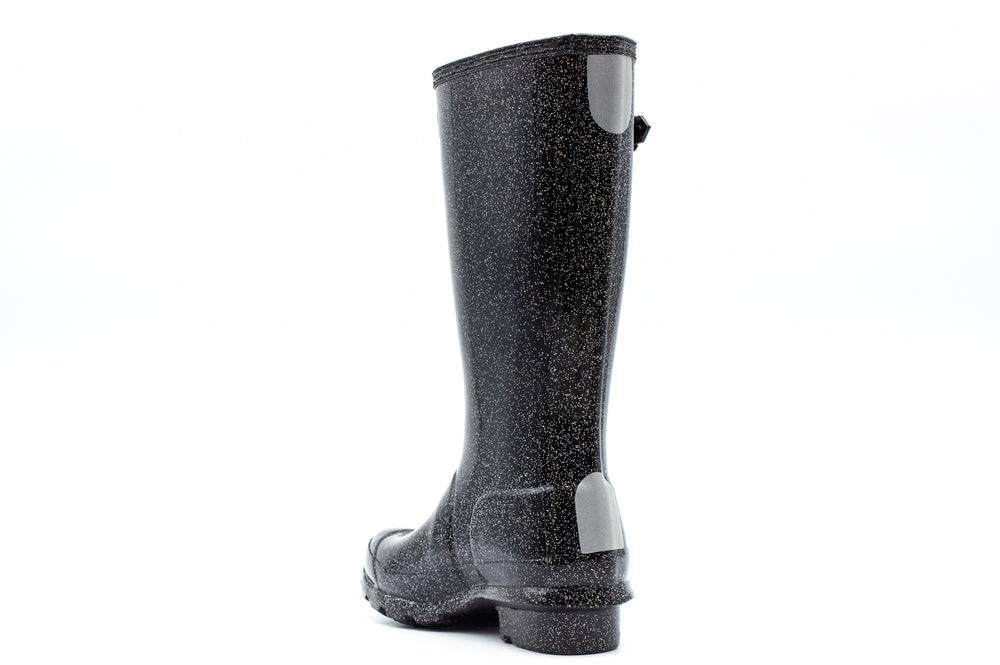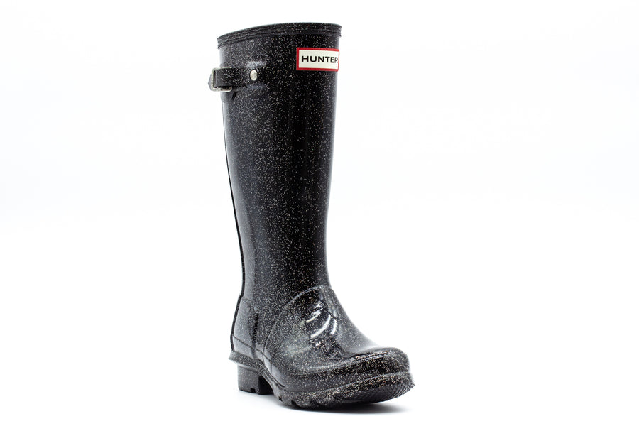 A mini version of the iconic Original Tall Boot, this kids boot is a dream for junior explorers. Handcrafted using a process unique to Hunter, the Original Kids Starcloud Boot adds a touch of sparkle to rainy days with a shimmering glitter finish over Hunter's classic glossy black. Designed for adventures, this specialised kids boot features a vulcanized natural rubber constuction highly resistant to wear and abrasion. With the added safety of reflective patches and the Hunter Original tread you can be confident letting them take on the elements whatever the weather. We recommend that all Hunter boots be worn with socks to protect the wearer's skin from contact with rubber.