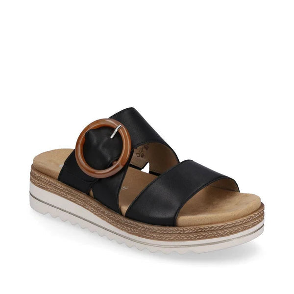 D0Q51 from Remonte are contemporary mules with leather straps that are lined with a suede-like soft textile for comfort. A similar textile lines the removable Remonte soft footbed which is both moulded and cushioned. D0Q51 sits on a flexible PU sole designed with a wedge and decorated with a pattern resembling braided jute for a summer feel. The arch strap attaches with a large section of Velcro allowing a degree of adjustability and has matching elastic sections that offer flexibility.