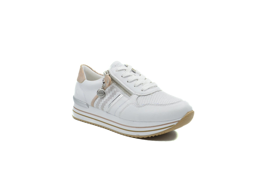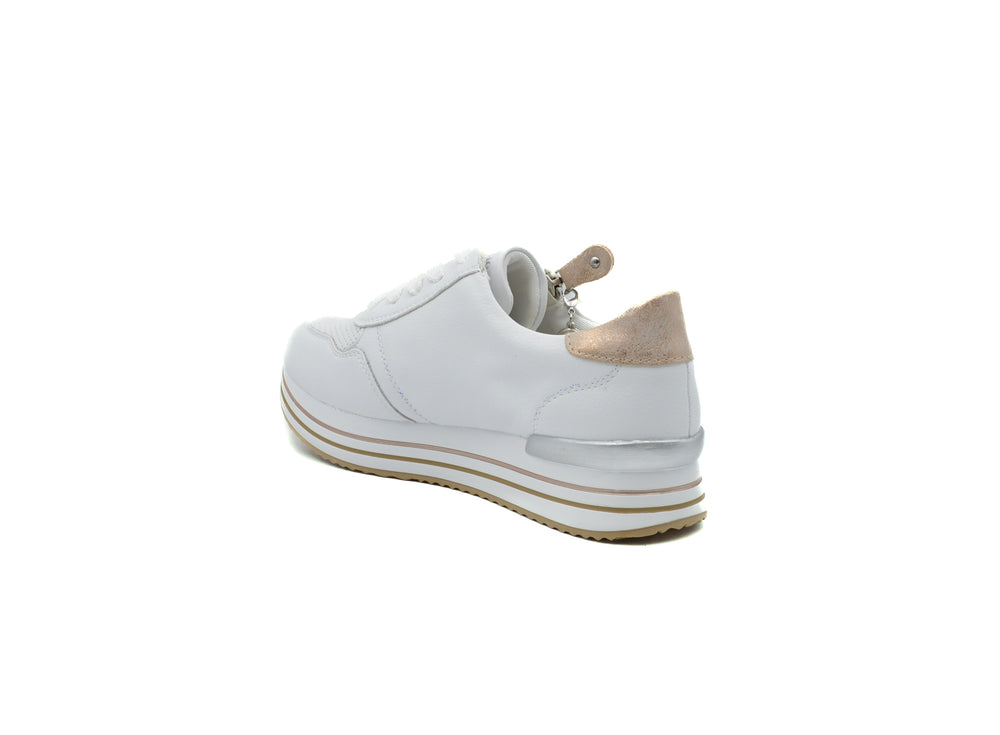 Dress white combo summer sneakers in soft leather and cushioning insole. Closure laces and side zipper. Insole is removable to fit orthotics. Style shown in Elle magazine.