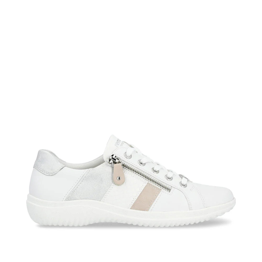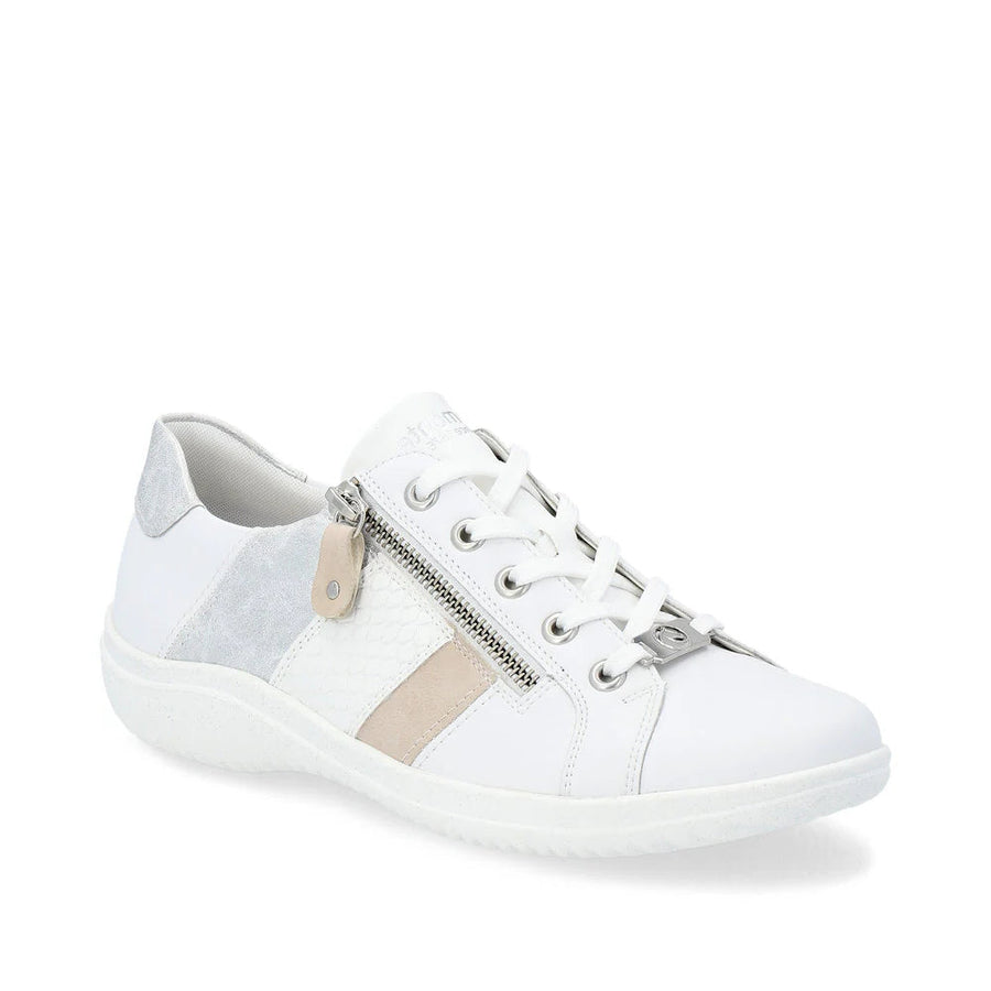 Happy feet, happy life! The white remonte lace-up shoes made of smooth leather are an absolute must-have in every remonte lace-up shoe cupboard. The lacing complements the zipper and thus guarantees optimal support and perfect fit. The Lite 'n Soft technology with its ultra-soft sole and padded and removable insole ensures a comfortable feeling. The shoes in comfort width are also available up to shoe size 45! Thanks to the light microvelour lining, ideal comfort is guaranteed. We love it!