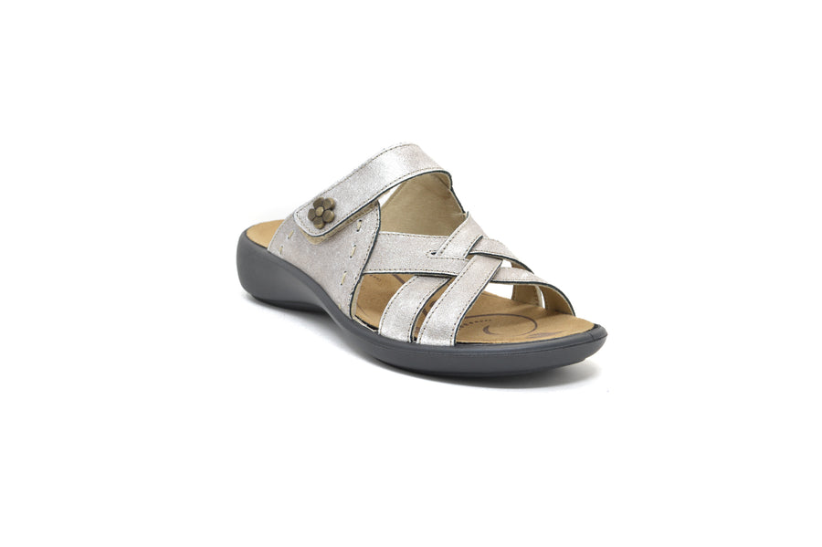 This easy-on slide sandal is an easy choice. Stitch details along with subtle flower hardware add just enough flair to make this your new favorite sandal.