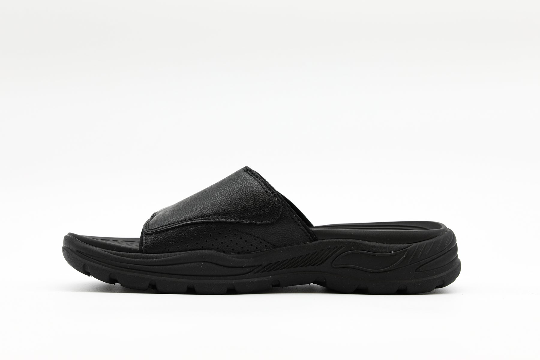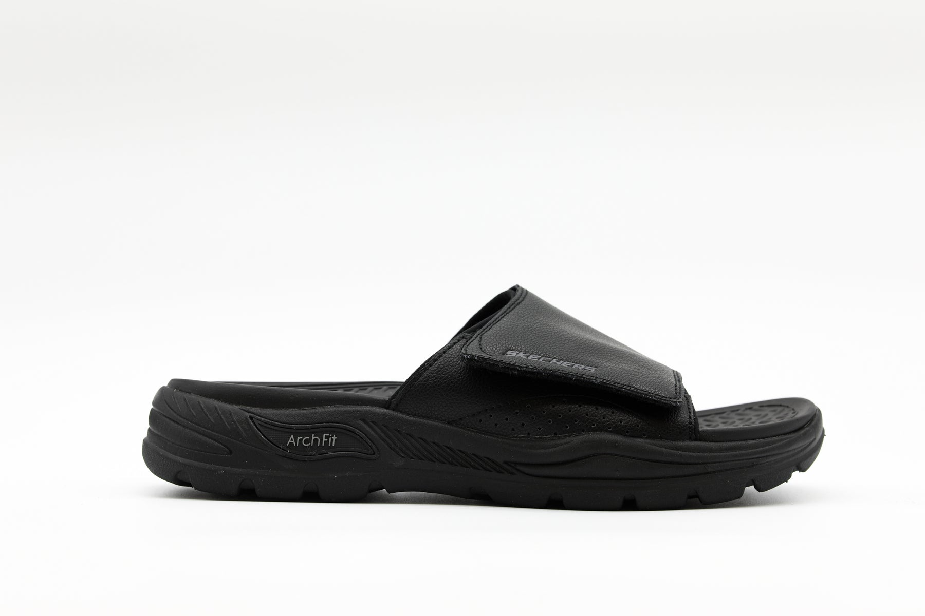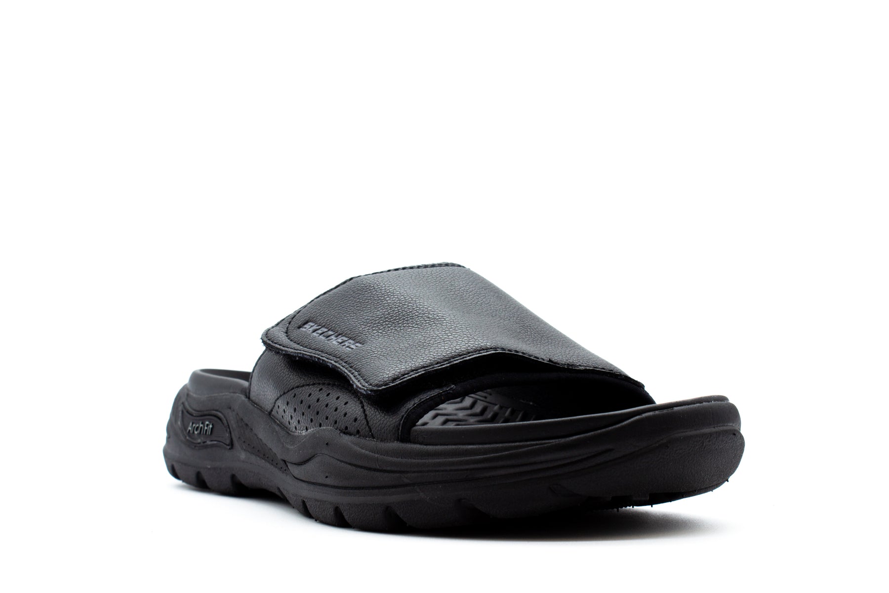 The ultimate solution for all-day comfort and classic warm weather style combine in the Skechers Arch Fit® - Revelo sandal. This slide style sandal features a leather upper with an Arch Fit® cushioned footbed.