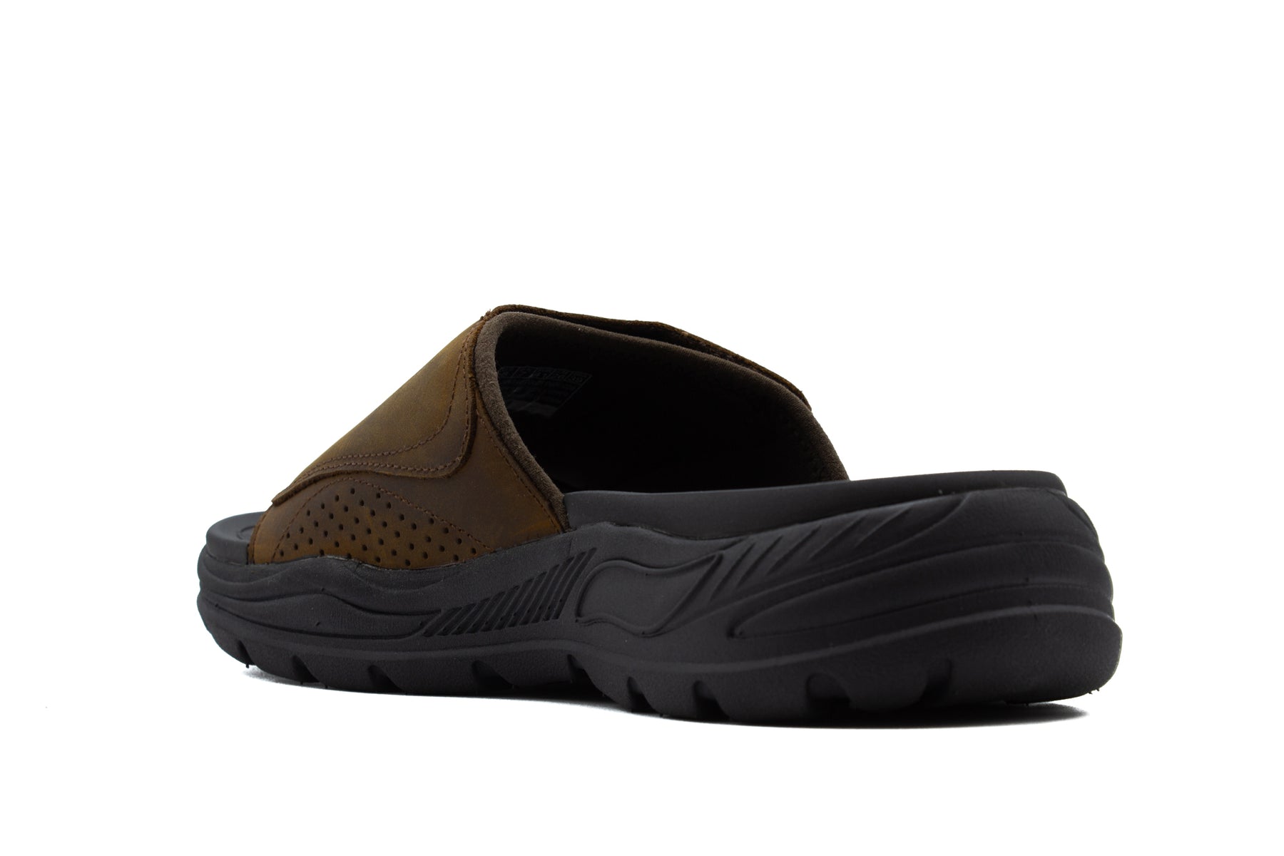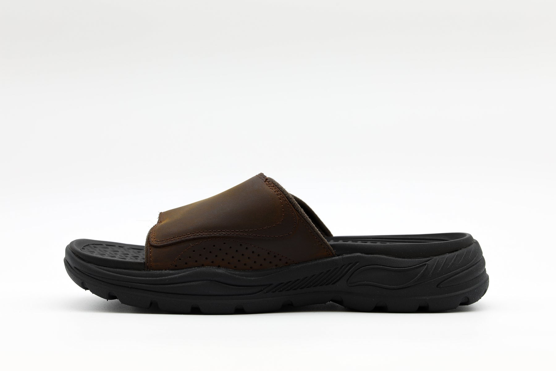 The ultimate solution for all-day comfort and classic warm weather style combine in the Skechers Arch Fit® - Revelo sandal. This slide style sandal features a leather upper with an Arch Fit® cushioned footbed.