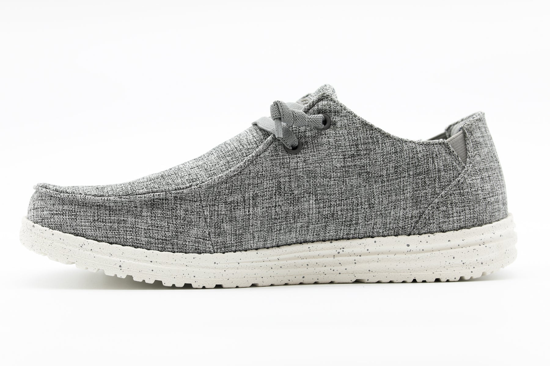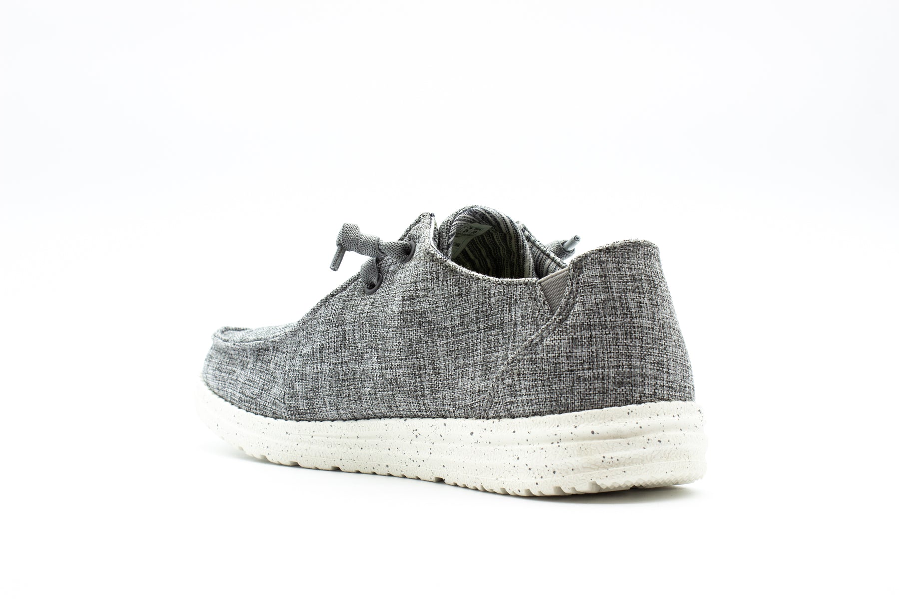 • Soft woven heathered tweed mesh fabric upper on gray and black colors