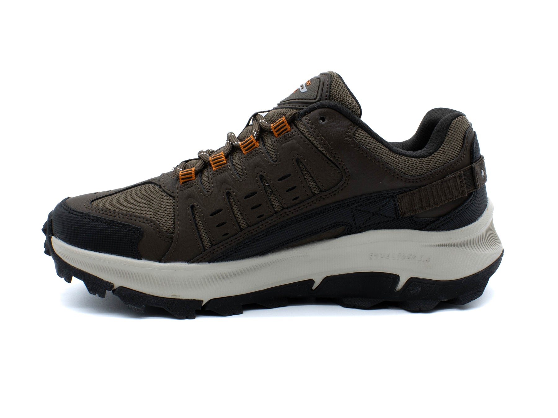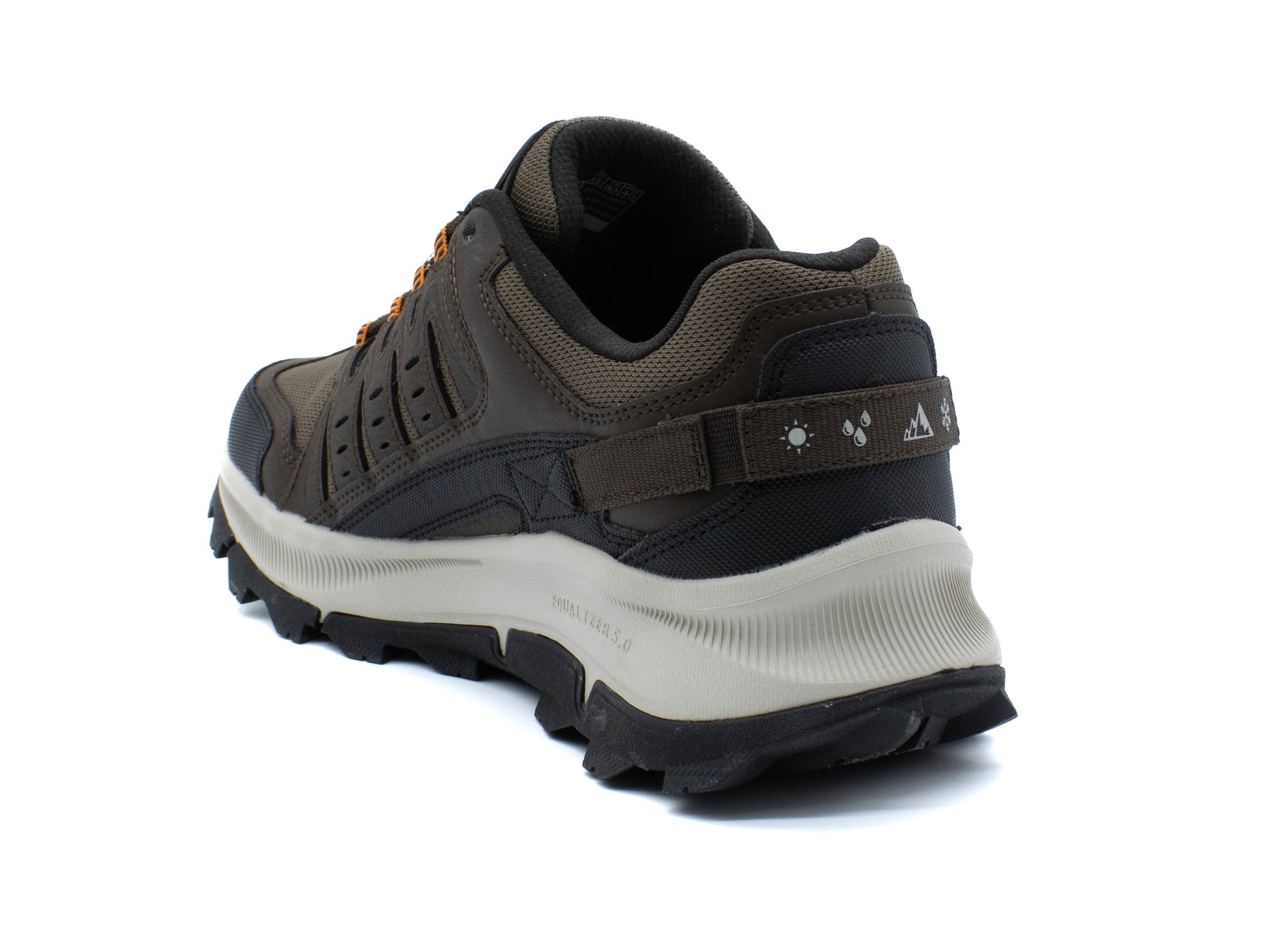 Find comfort in the great outdoors wearing Skechers Relaxed Fit®: Equalizer 5.0 Trail - Solix. This lace-up water-repellent trail design features a durable textile and leather upper with a high-traction all-terrain outsole and a Skechers Air-Cooled Memory Foam® cushioned comfort insole.