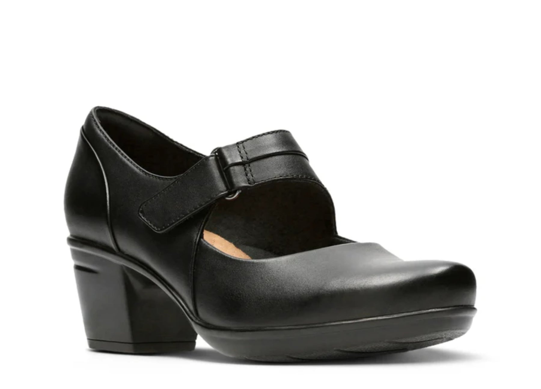 A supple leather shoe designed for maximum comfort. A low, chunky heel boosts height without creating a challenge, and a simple hook-and-loop closure provides an easy and adjustable fit. Layers of Clarks Cushion Soft padding with an impact-absorbing OrthoLite footbed reduce the shock of each step. The emslie lulling is an exciting new shoe from the clarks collection. great for work or play, this mary jane will keep you comfortable with cushion soft technology and an ortholite footbed.
