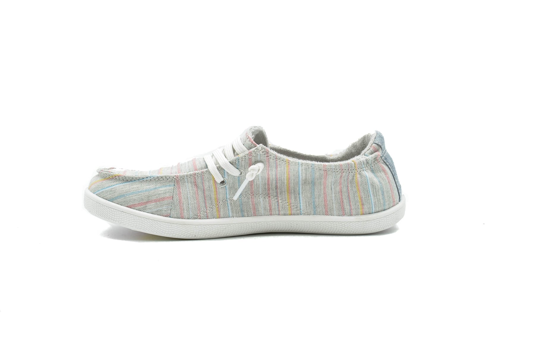 - Slip-on color striped fabric upper with decorative laces and moc toe front