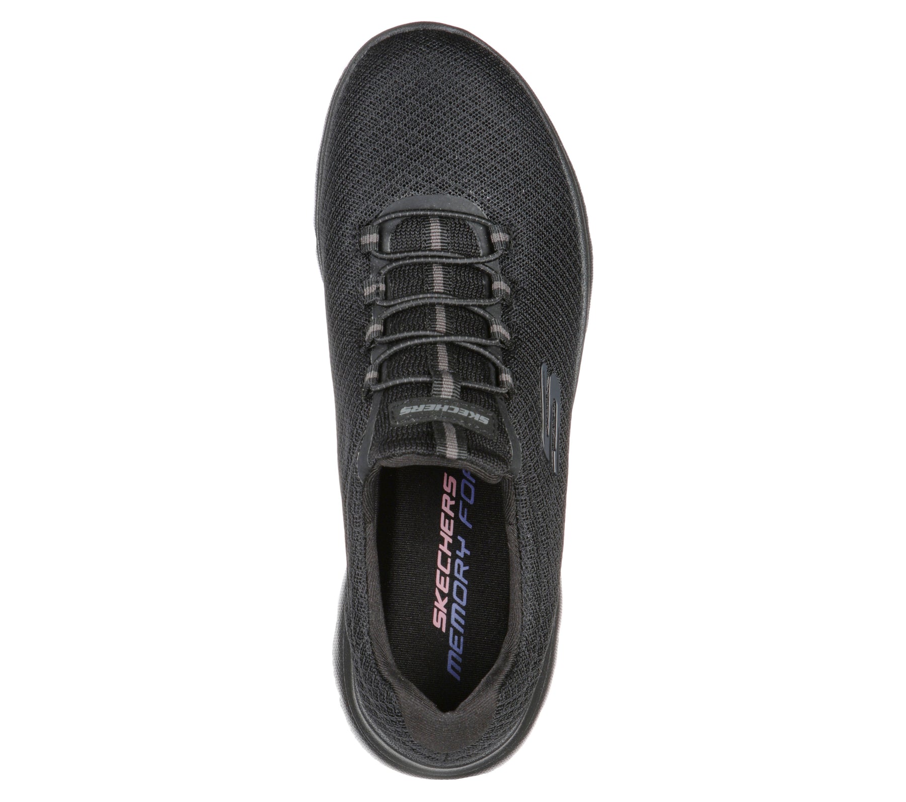 Get right to the sporty style and comfort wearing the Summits black slip on sneaker from Skechers. Nearly one piece soft heathered jersey knit mesh fabric upper in a bungee laced slip on athletic training sneaker with stitching accents. Memory Foam insole for added comfort. Mesh panels at heel and instep for great breathability.