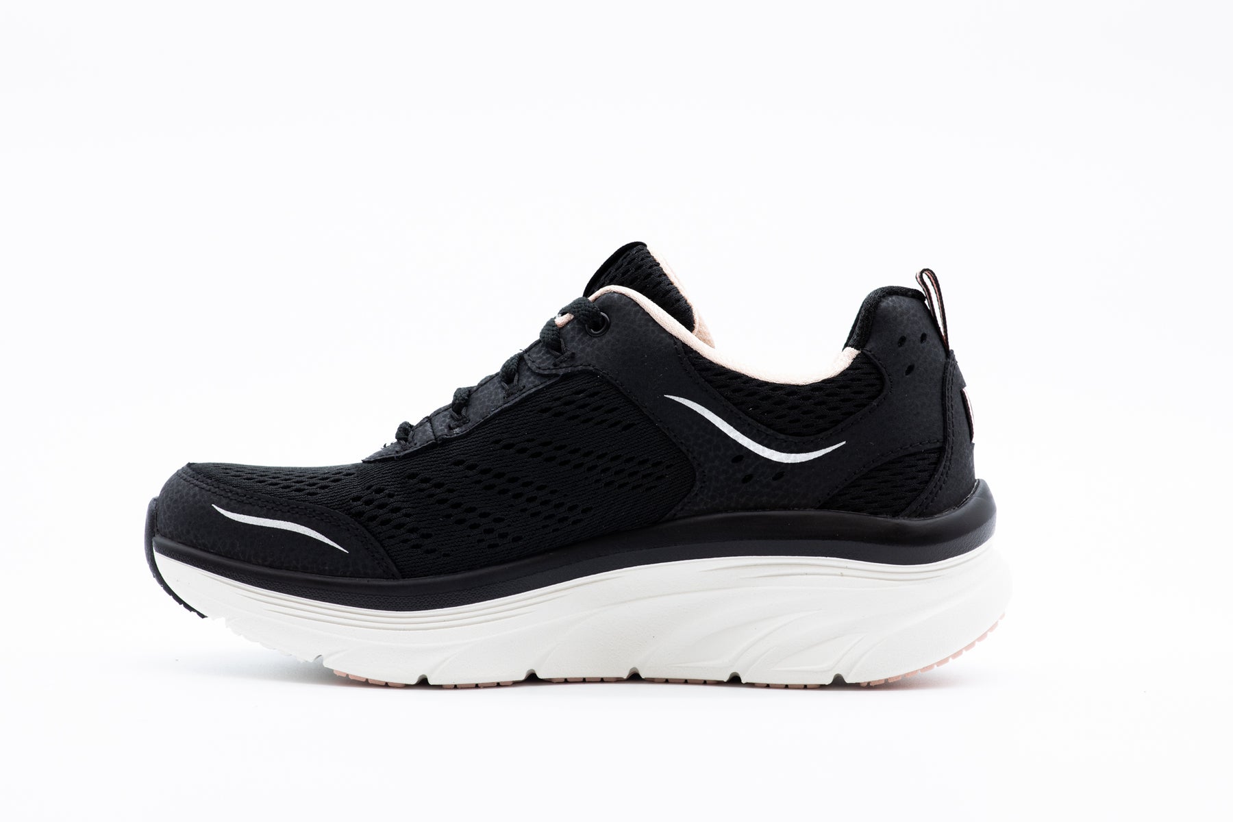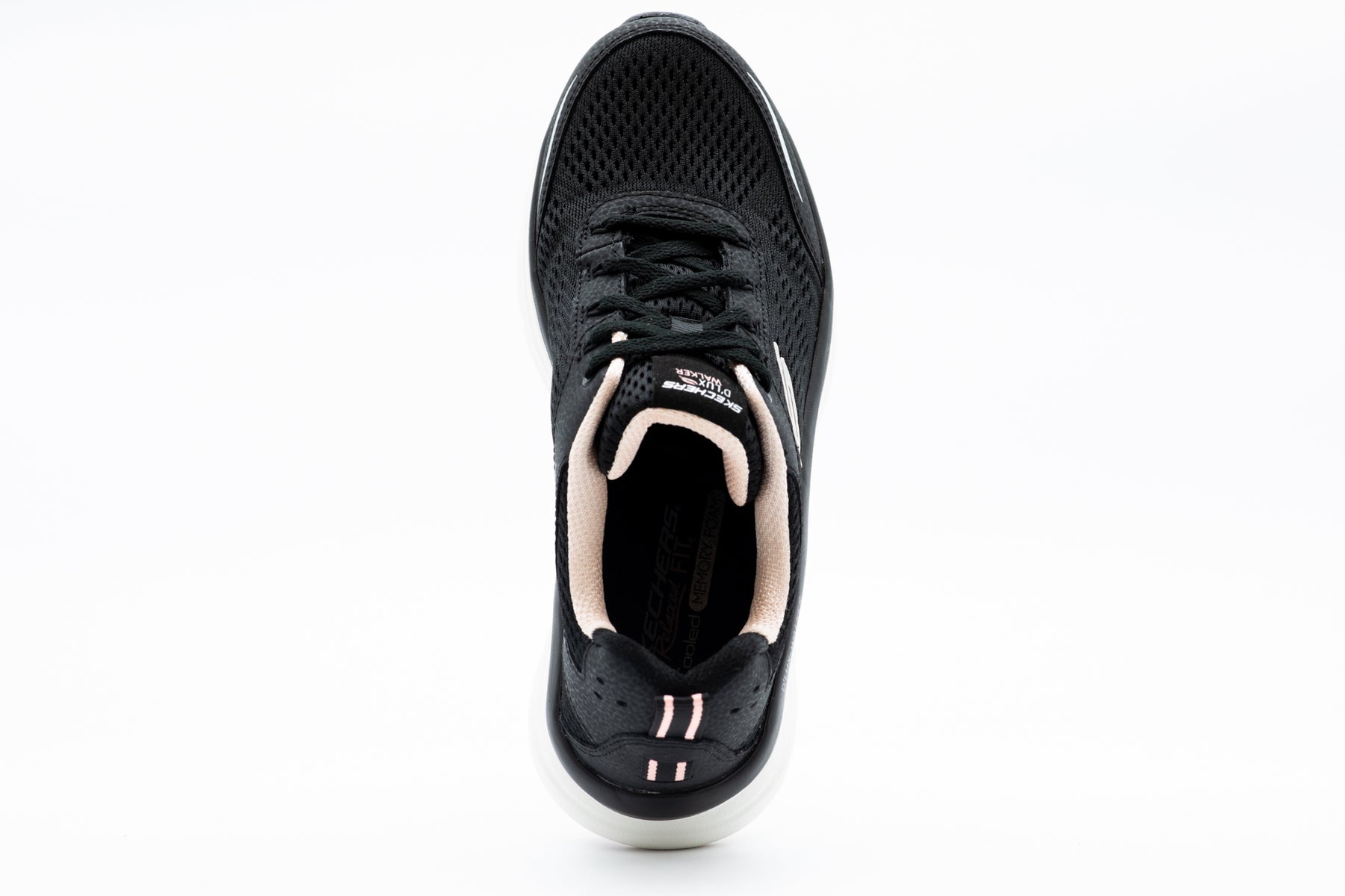 Amazing support and cushioning for long walks combines with sleek sporty style in the D'Lux Walker Infinite Motion black sneaker from Skechers. Featuring a soft engineered mesh fabric upper in a lace up athletic comfort walking sneaker with stitching and overlay accents. Well cushioned Skech-Foam midsole, Air Cooled Memory Foam insole for added comfort.