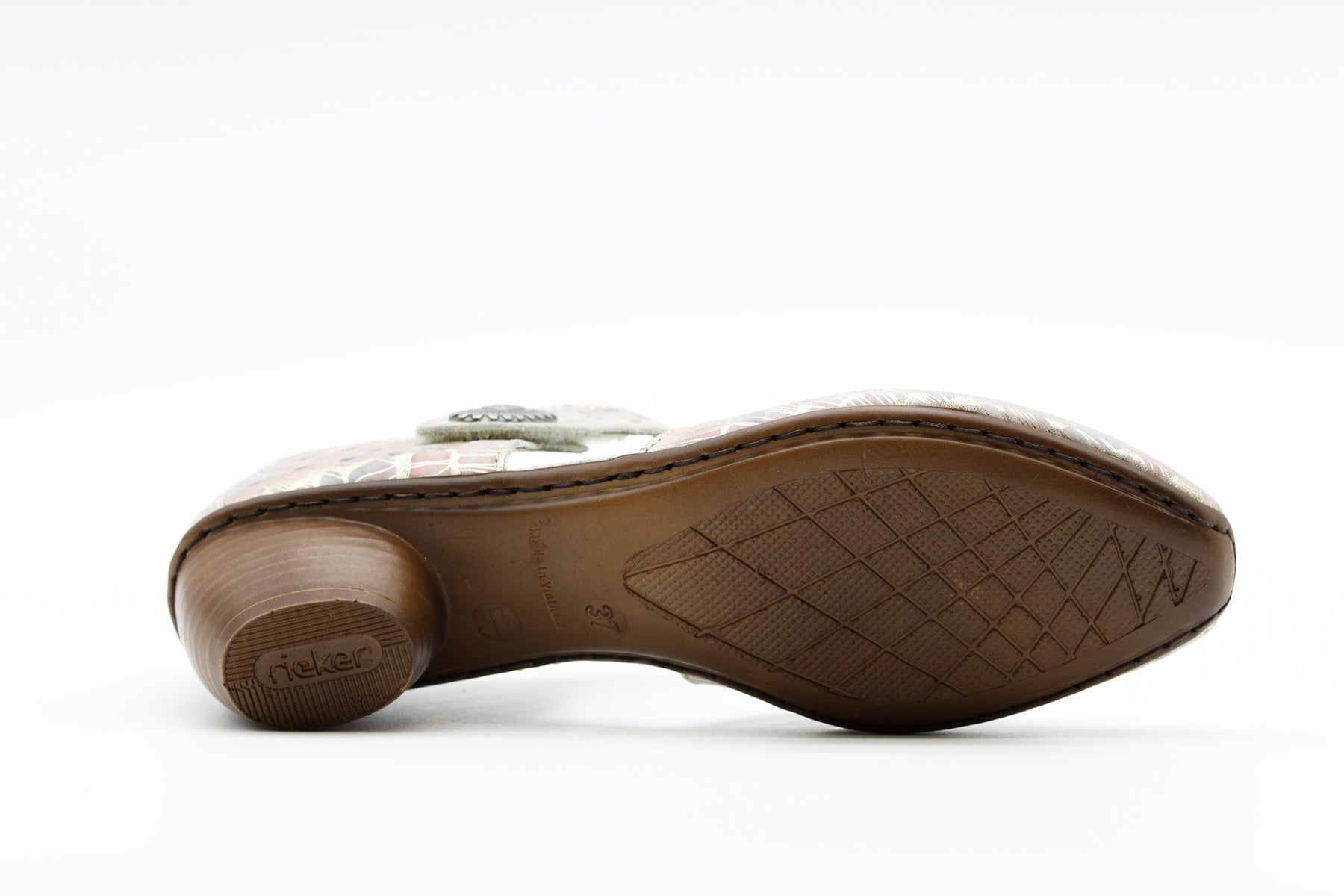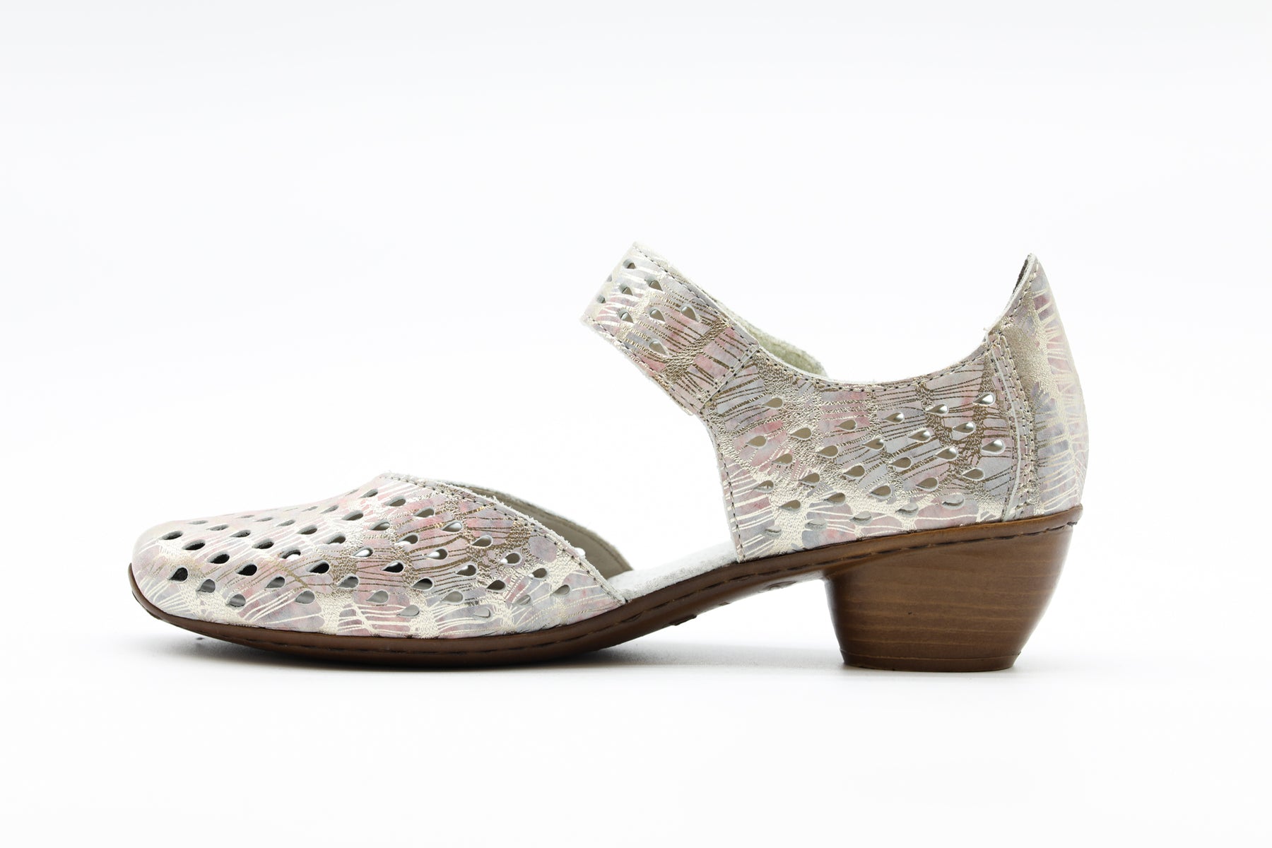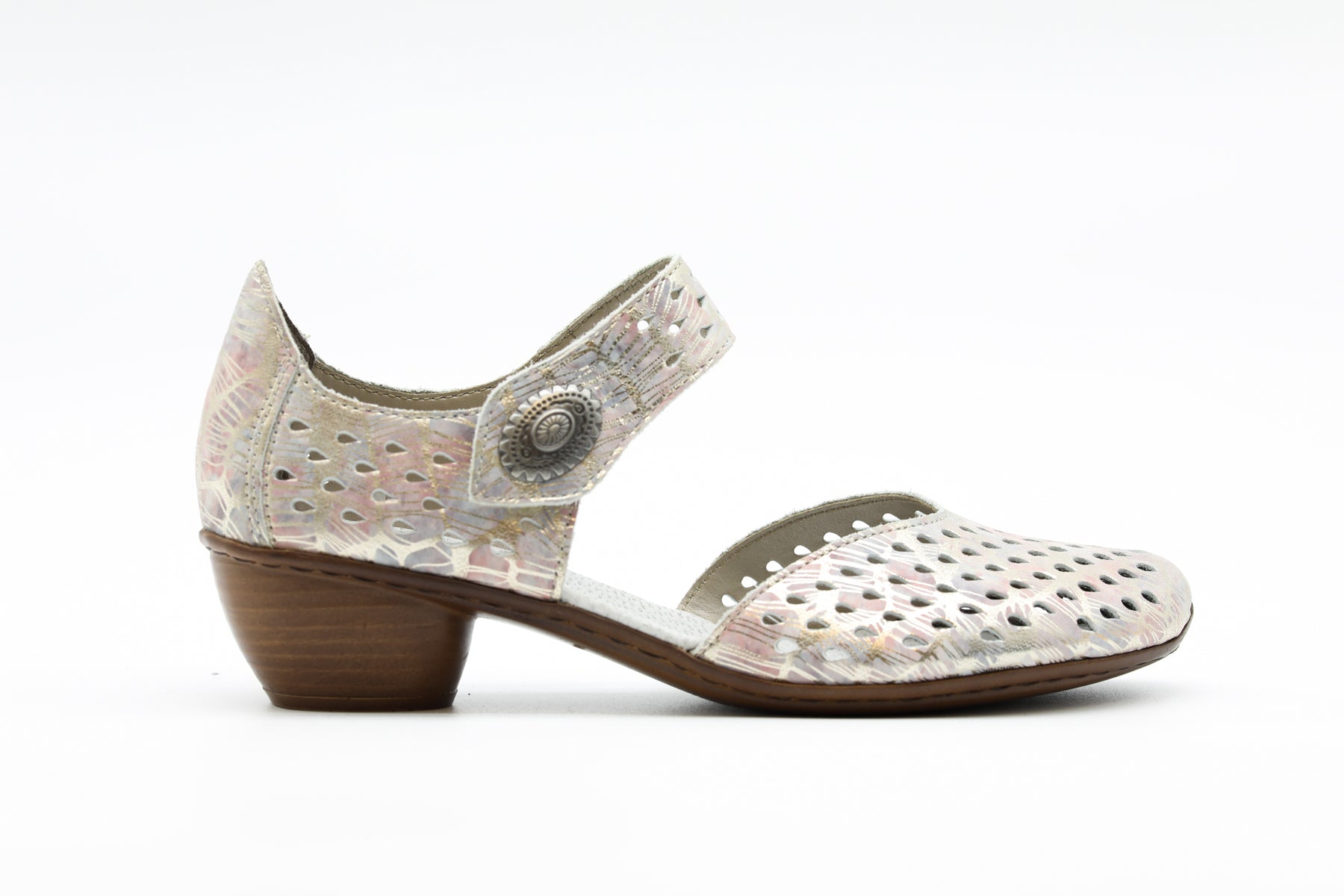 Ladies shoes with low heel and hook and loop fastening strap. These shoes have a stencil detailing as well as a pretty multi colour pastel print.