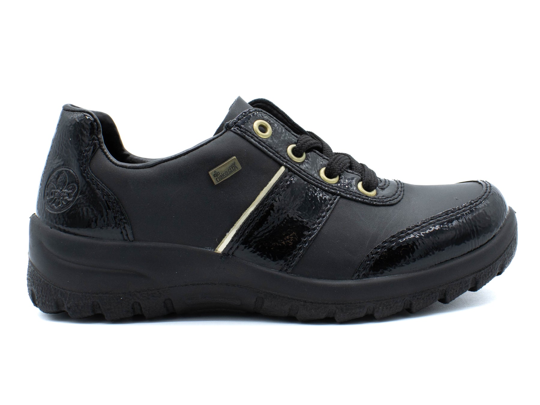 L7120-00 is a handy trainer style lace-up from Rieker that uses a combination of synthetic and real leathers in the upper, the patent touches and gold details giving L7120-00 a smarter look. Treated to Rieker-Tex, this is a water-resistant style. L7120-00 has a chunky PU sole that offers a hard-wearing base with both flexibility and shock-absorption.