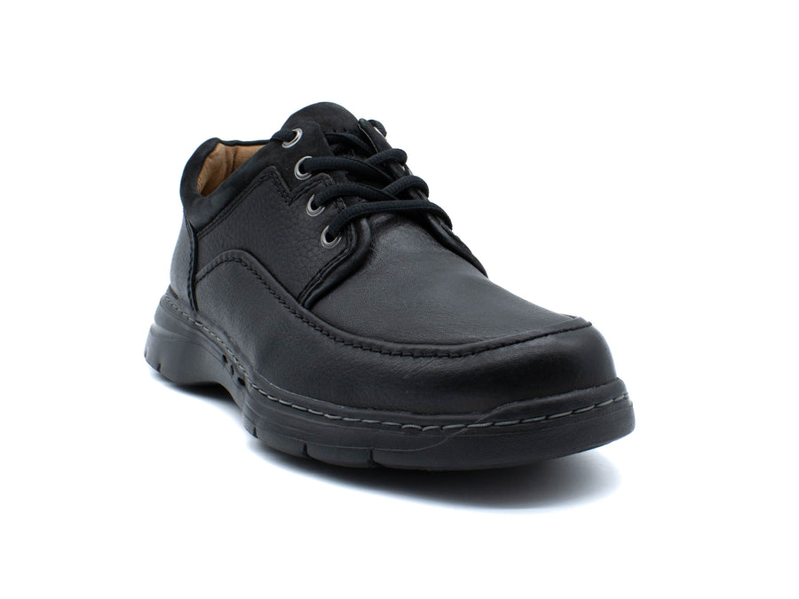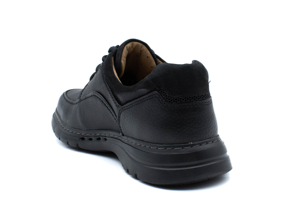 From our Unstructured collection, this lace-up casual shoe benefits from a unique air circulation system to ensure a cool and comfortable step. The black tumbled leather upper features authentic stitch detailing that nods towards the craftsmanship that goes into each shoe. Lightweight, flexible and durable thanks to the high rebound, part eco foam OrthoLite® footbed and EVA and reponsibly sourced rubber mix sole, these shoes have a full leather lining and sock for a touch of luxury underfoot.