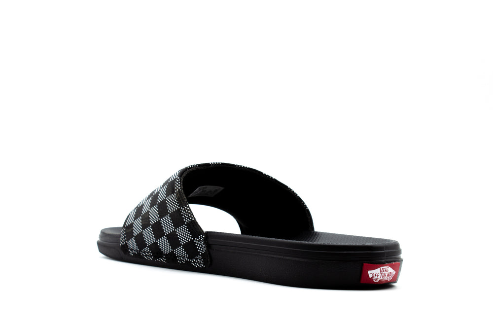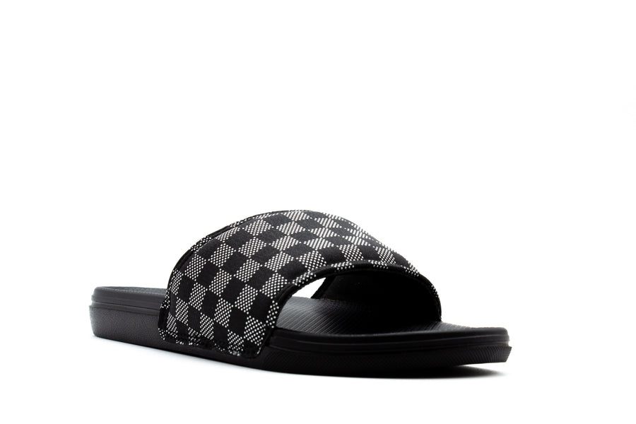 Offering ultimate comfort and all-day ease, the Range Slide On checkered black slide sandal from Vans featuring synthetic leather straps with foam-backed soft stretch textile liners, heritage-inspired print details, and molded and durable PU footbeds with anatomical arch support. It is made with water-based inks and glues. Perfect for slipping on last minute to run out of the house!