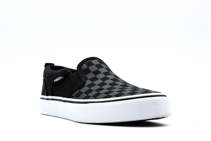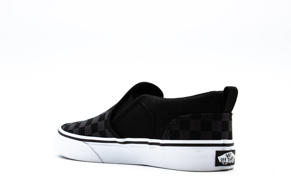 Dress yourself in a classic skate style with the black/ black Asher checkered slip on sneakers from Vans. Featuring a durable canvas upper with a low profile skate shoe design. Slip-on construction with elastic goring makes for any easy on/off comfort and style. The Asher slip on style from Vans comes with their signature waffle pattern on rubber outsole.