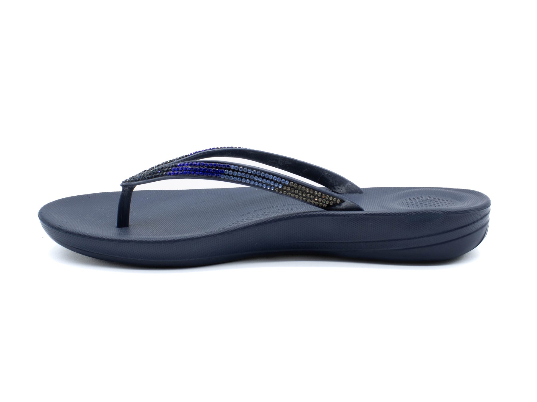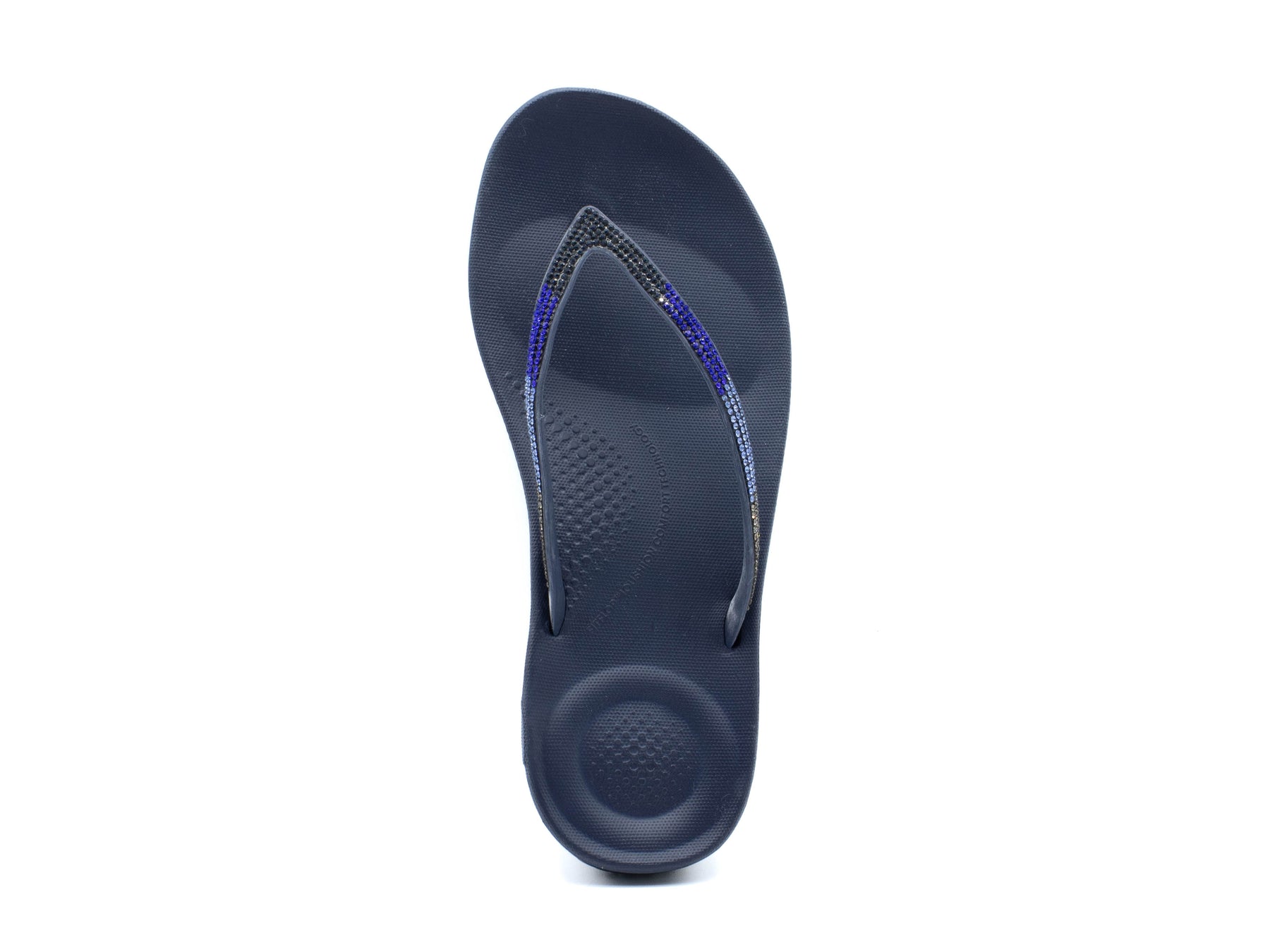 From the top, they look like your classic beach flip-flops. Underneath, they’re biomechanically engineered with our featherlight, pressure-diffusing iQushion™ midsole tech. Made of high-rebound air-foam that retains its cushioning, with heel and ball-of-foot impact pillows, and a contoured arch-curve for natural support when you walk. Anatomically shaped straps hold the sandals to you, to help stop toes gripping. This version adorned with shimmering micro-'crystals' in a pretty ombré design, throw these sparkle flip-flops in your suitcase and you’ll find yourself wearing them to beach, bar and beyond. Waterproof and slip-resistant.Sizing note: These iQushion flip-flops fit slightly small. If you fit between sizes, we recommend you go up in size rather than down.