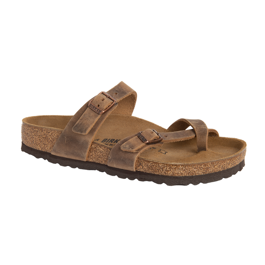 The MAYARI leather tobacco toe sleeve sandal with an orthotic footbed provides excellent arch and metatarsal support. Durable EVA outsole, cork footbed molds to each individual foot to provide a custom fit. This BIRKENSTOCK sandal is a genuine classic, emphasizing the handcrafted and natural look of stylish sandals. A comfort legend and a fashion staple. Features & Benefits Oiled leather upper Suede covered footbed Cork-latex midsole Built-in arch support Toe grip for added support & comfort Deep heel cup keeps your foot properly aligned Lightweight EVA sole helps absorb shock Adjustable straps with buckles for a custom fit Design Elements Cork Adjustable Straps Contoured Footbed EVA Outsole Latex Oiled Leather Upper
