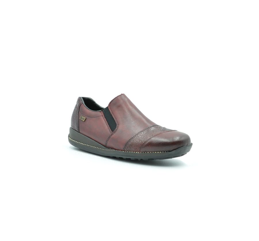 These Rieker shoes showcase a unique cloudy red leather exterior with maroon detailing on the toe and heel. Easy slip-on design makes these shoes perfect for daily wear while making a chic statement.
