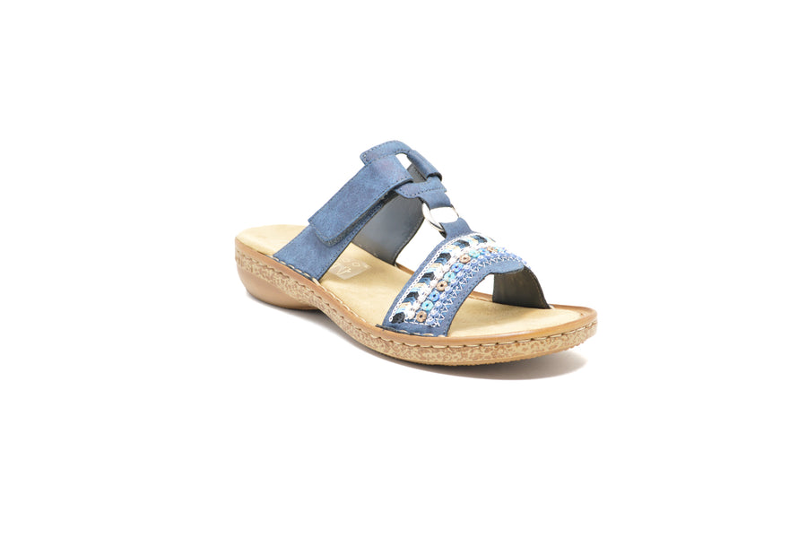 Ladies blue slip on mules with decorative strip across the toe with gems, sequins and contrasting stitching
