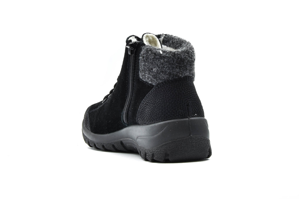 These confident, black women's lace-up boot by RIEKER is wonderfully comfortable thanks to the flexible outsole and the warm lining made of cuddly textile fleece. Together with the high shaft and the lacing of the boot you have optimal hold, while the zipper on the inside of the shoe allows you to put on the boot easily. Visual highlights of this boot are the beautiful decorative zipper and the felt collar on the shaft edge. The upper of the boot is made of a mix of genuine leather and imitation leather and is equipped with the RiekerTex™ membrane.