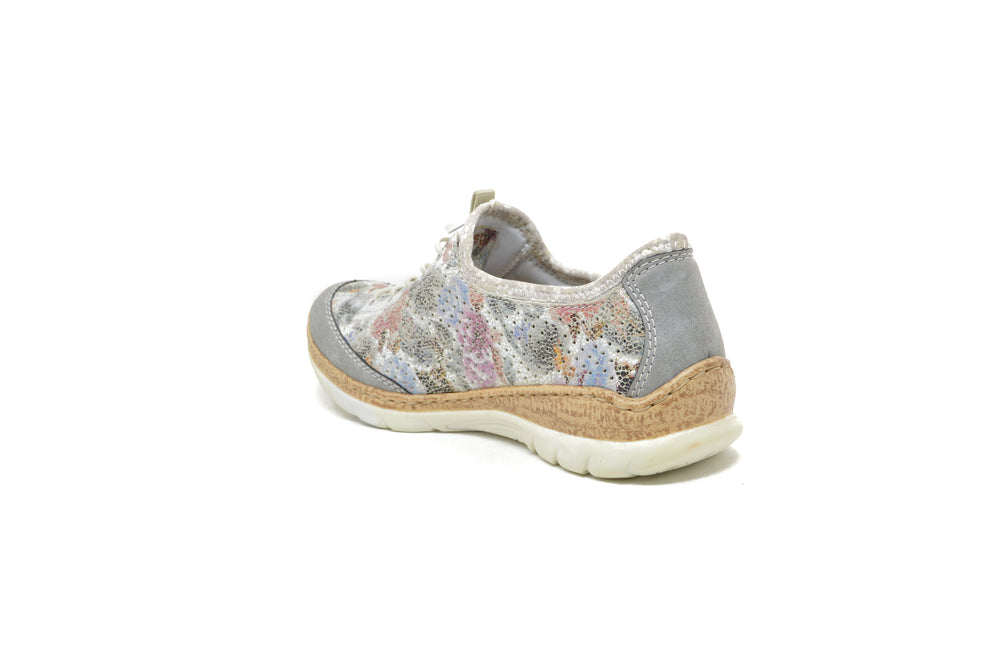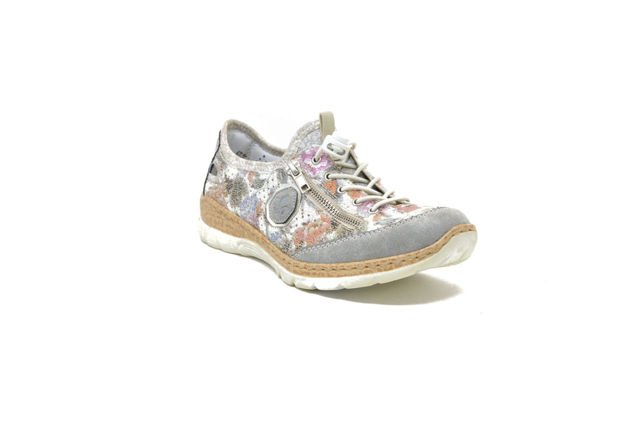 The Rieker N42V1-40 is a cute slip on shoe with a multi colored flower pattern and decorative side zip.