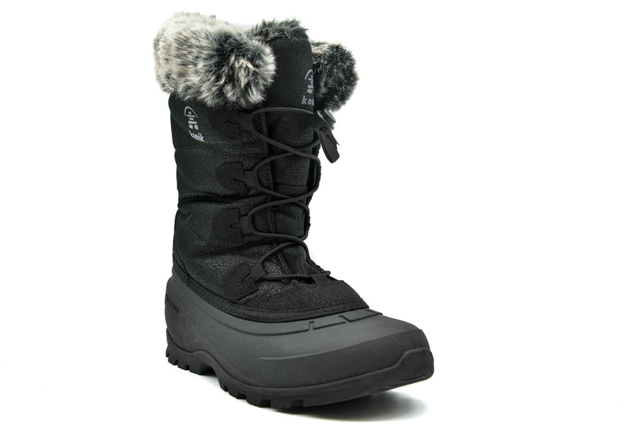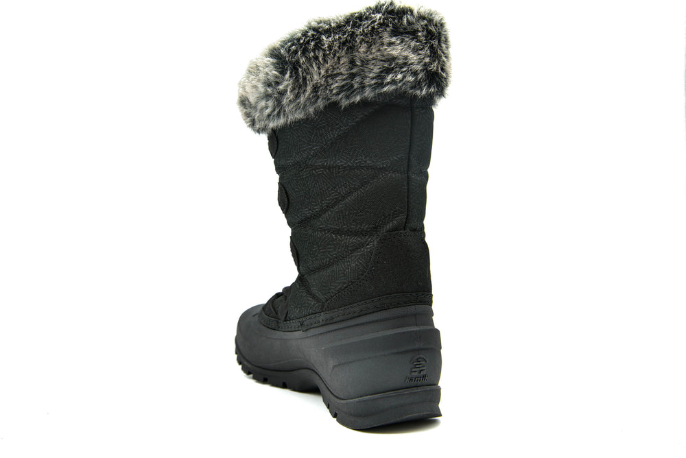 Be prepared to face the snowy outdoors with these women's Kamik Momentum 3 black winter boots. Made of durable nylon upper with waterproof, seam sealed construction, these vegan-friendly winter boots are designed with a round toe, bungee lacing, logo details, plush furry collar, -40°C cold rating, and an ICEKISS dual-density synthetic rubber outsole.