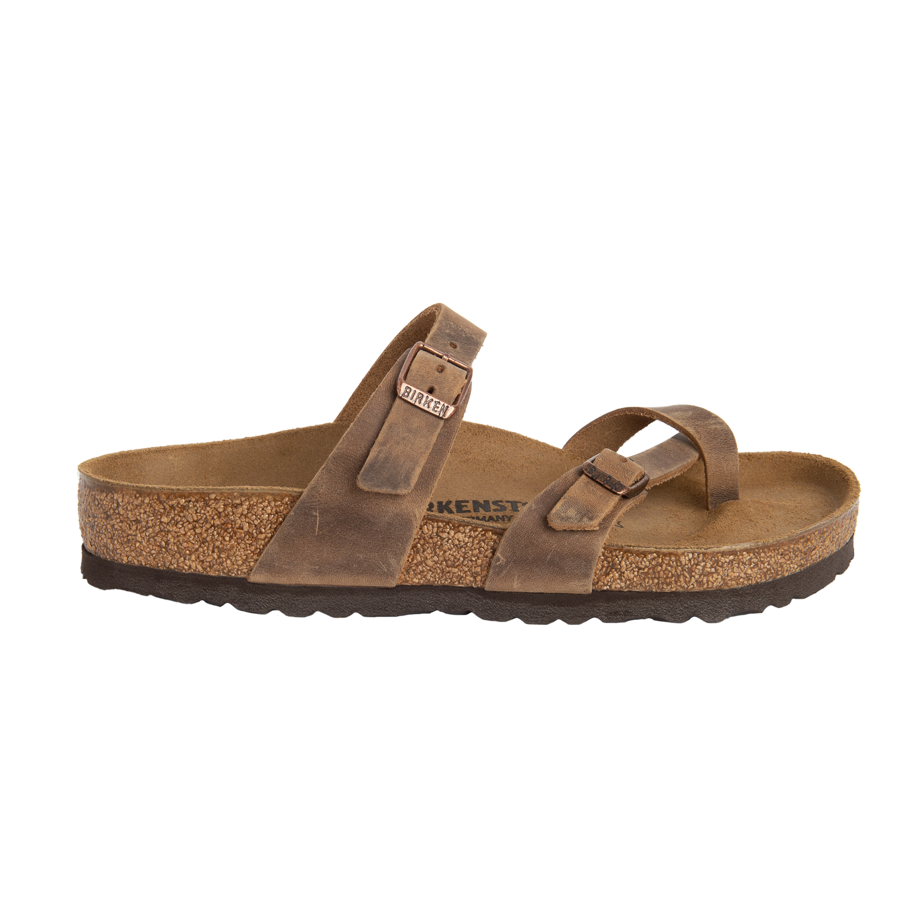 The MAYARI leather tobacco toe sleeve sandal with an orthotic footbed provides excellent arch and metatarsal support. Durable EVA outsole, cork footbed molds to each individual foot to provide a custom fit. This BIRKENSTOCK sandal is a genuine classic, emphasizing the handcrafted and natural look of stylish sandals. A comfort legend and a fashion staple. Features & Benefits Oiled leather upper Suede covered footbed Cork-latex midsole Built-in arch support Toe grip for added support & comfort Deep heel cup keeps your foot properly aligned Lightweight EVA sole helps absorb shock Adjustable straps with buckles for a custom fit Design Elements Cork Adjustable Straps Contoured Footbed EVA Outsole Latex Oiled Leather Upper