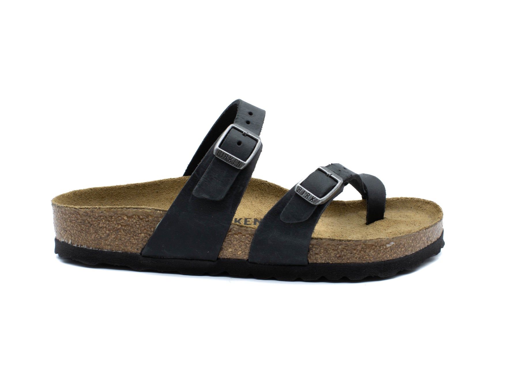 The Mayari Oily Leather black toe sleeve sandal with an orthotic footbed provides excellent arch support. Durable EVA outsole, cork footbed molds to each individual foot to provide a custom fit. This Birkenstock sandal is a genuine classic, emphasizing the handcrafted and natural look of stylish sandals. A comfort legend and a fashion staple.