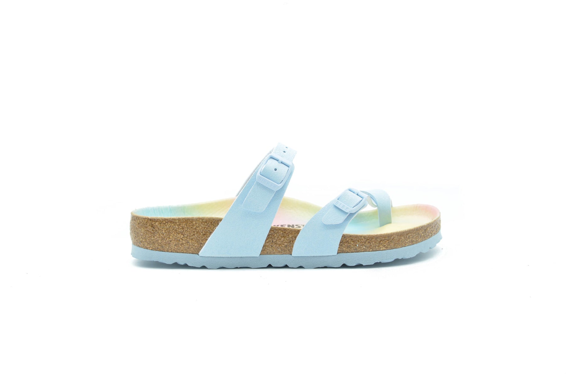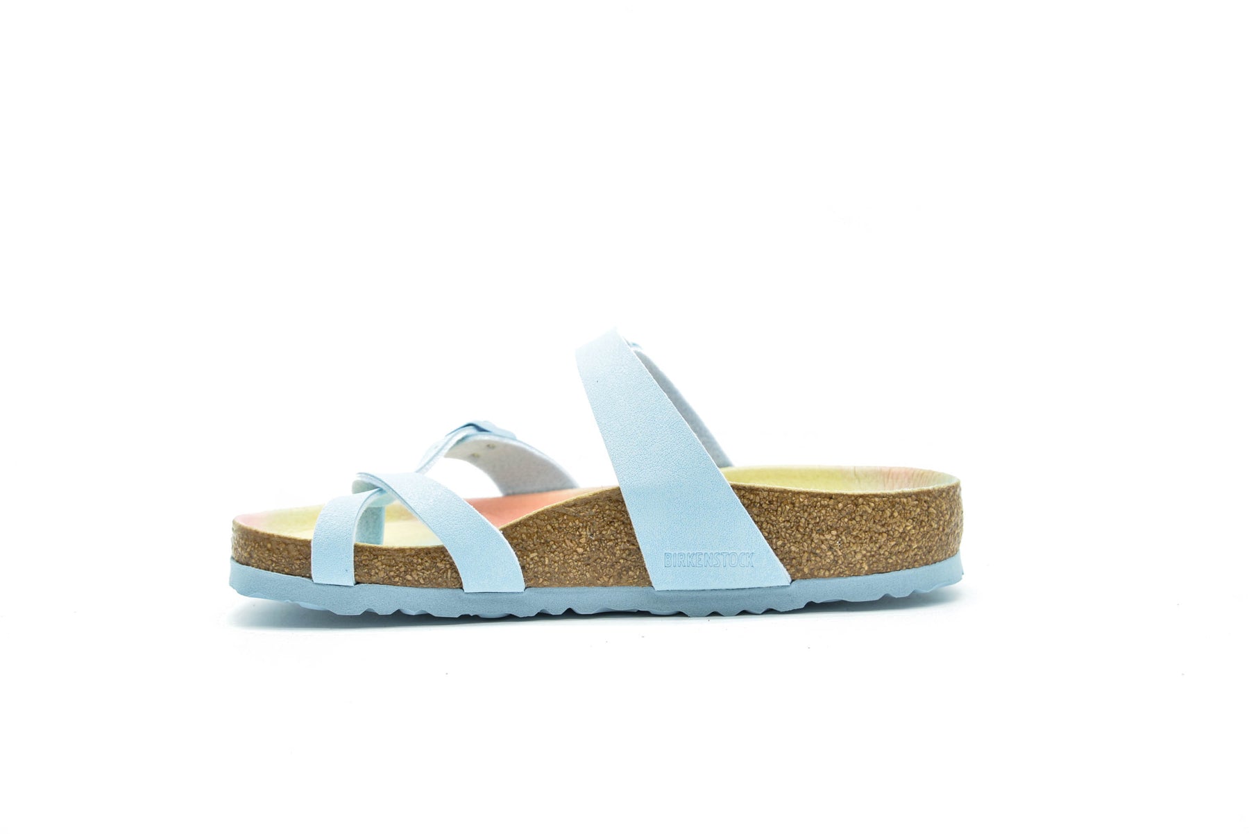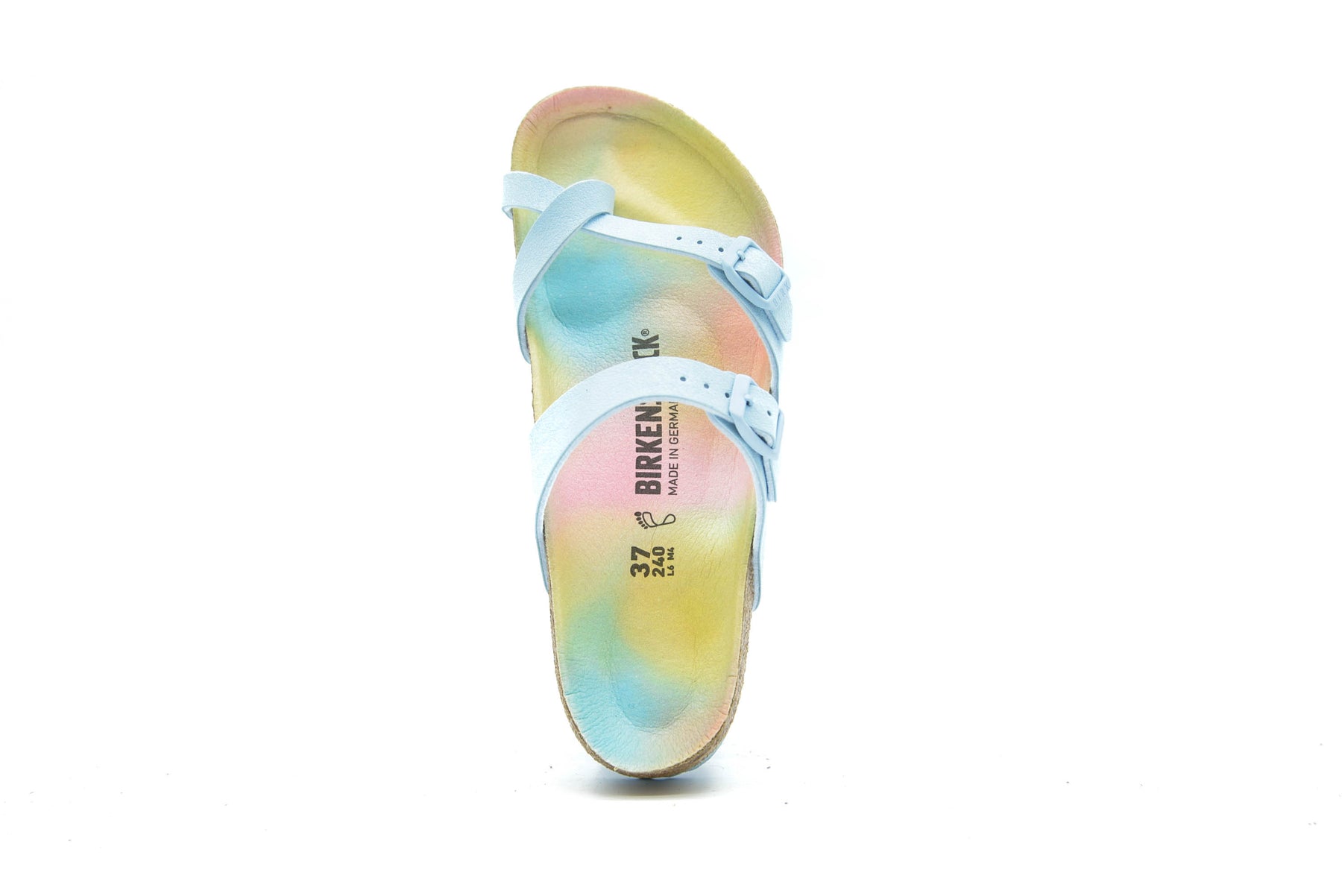 The Mayari from BIRKENSTOCK - an elegantly comfortable sandal with adjustable, crisscrossing straps that form a single loop around the toe. Classic support and adjustability, designed beautifully. This version features a chic, geometric print on the footbed lining. Available in vegan materials and includes an upper made from Birkibuc, a skin friendly, hard-wearing synthetic material.