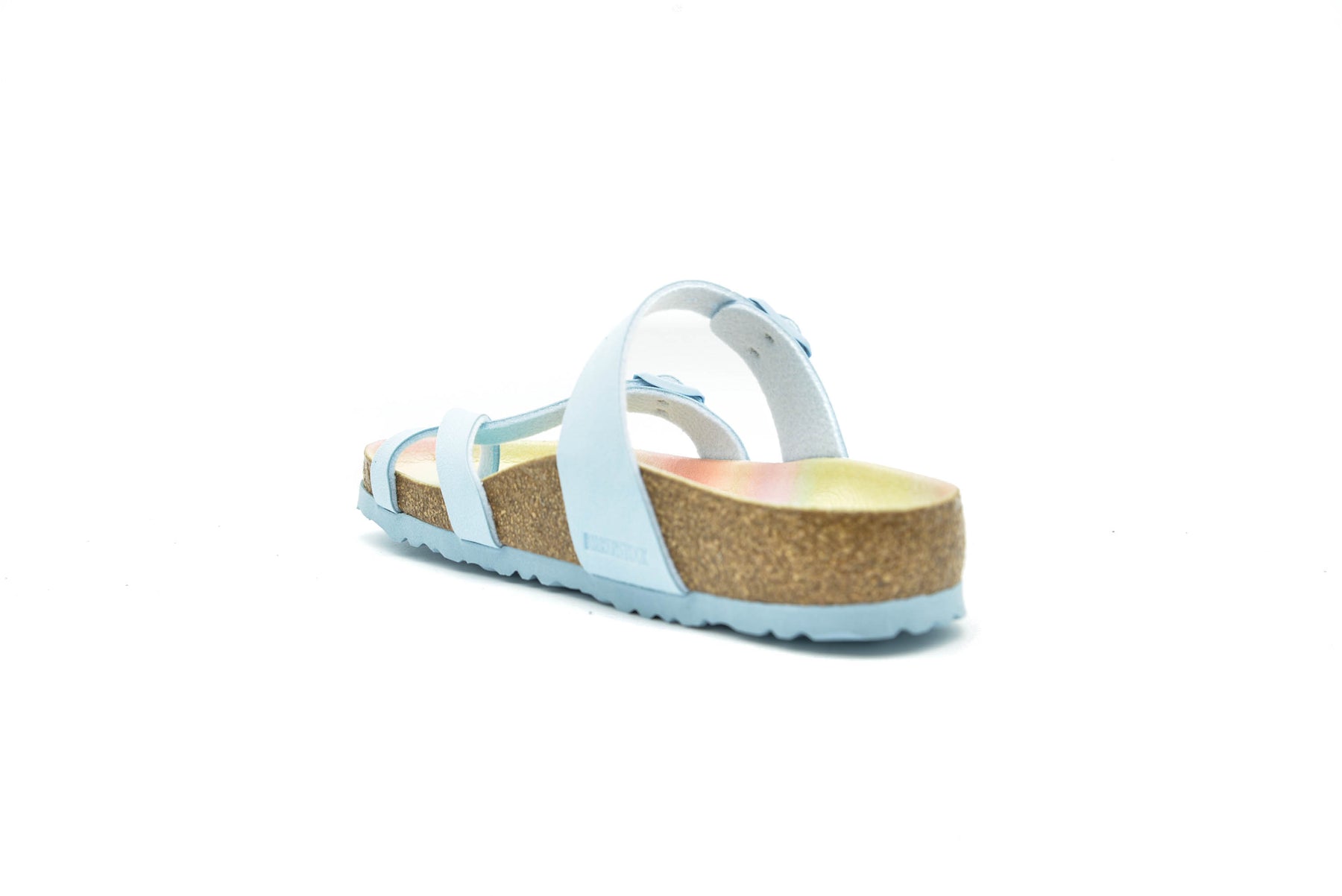 - Details: two straps, each with an individually adjustable metal pin buckle; toe loop; color-coordinated outsole; vegan