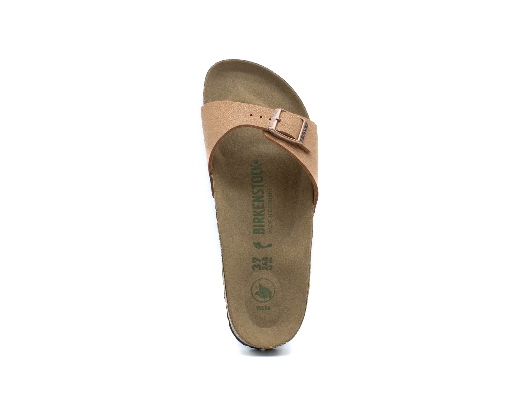A strap, a buckle and a contoured cork footbed are masterfully combined to create the original Birkenstock sandal - the Madrid. An iconic slide with a classic buckle accent now available in a vegan material. The upper is made from the skin-friendly, hard-wearing synthetic material Birkibuc.