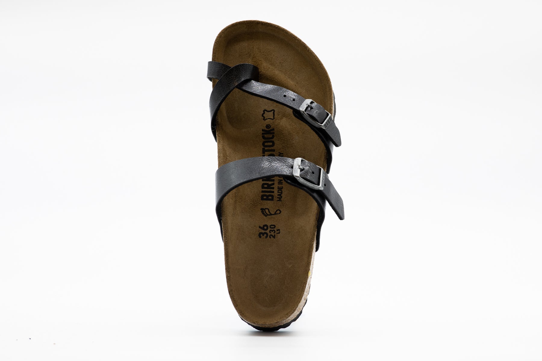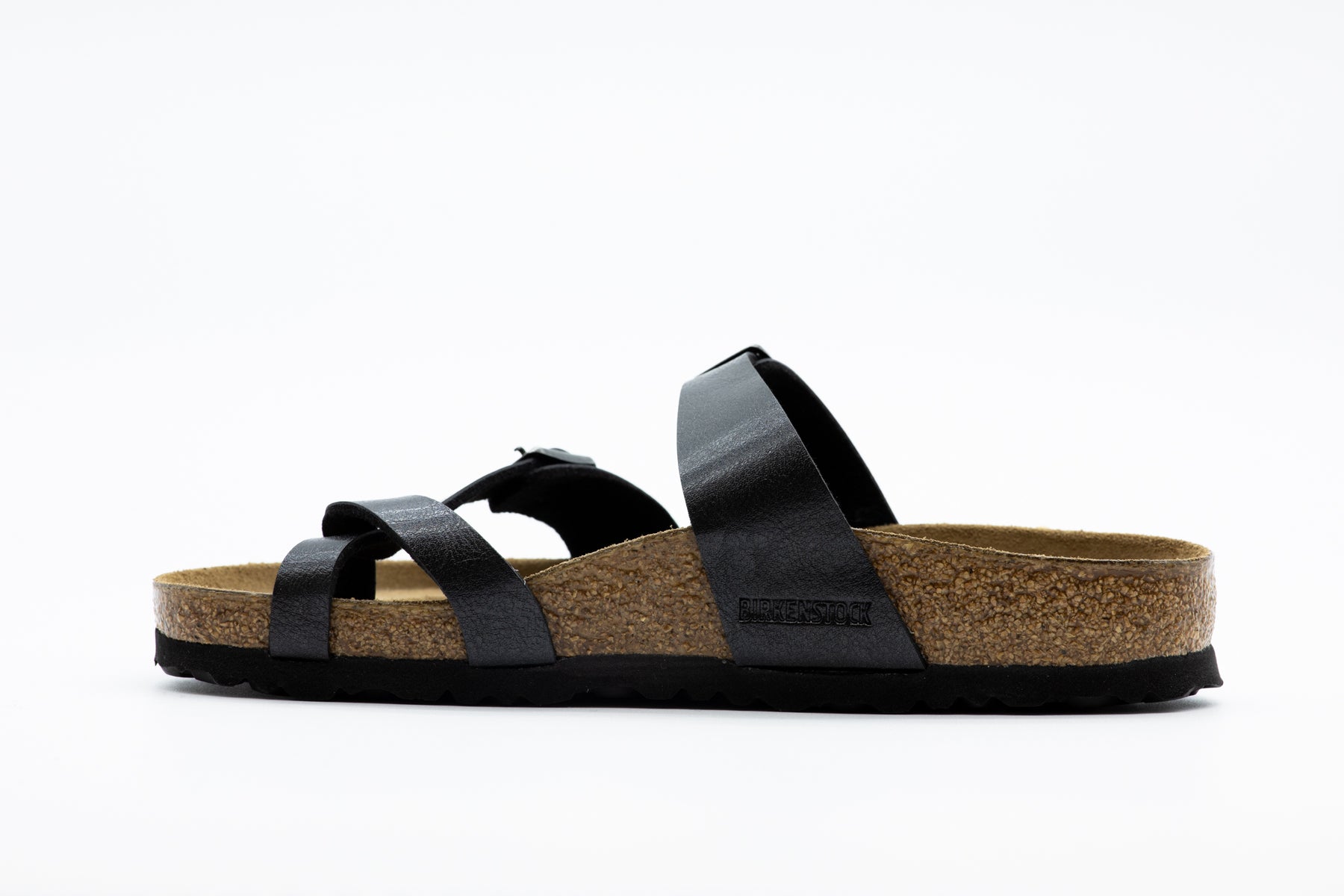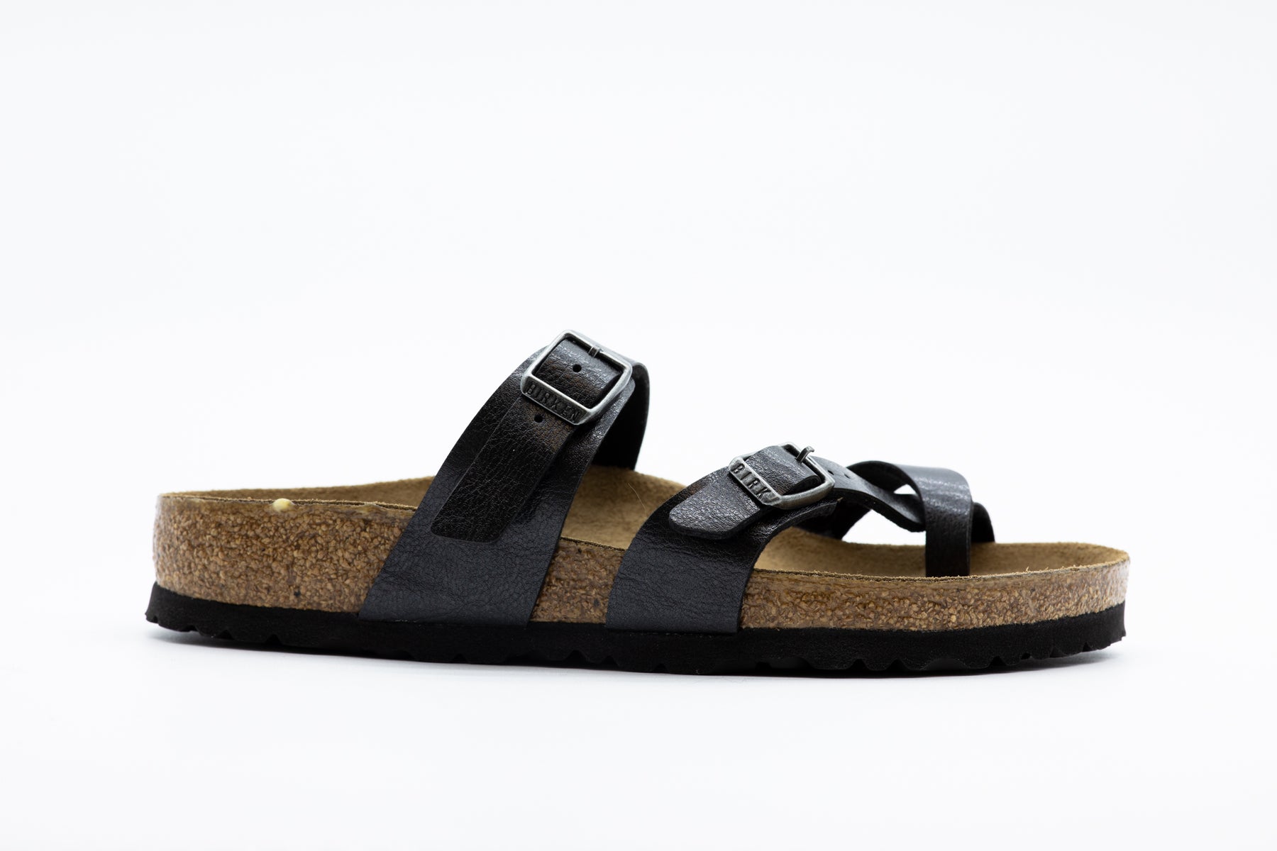 The Mayari from BIRKENSTOCK - an elegantly comfortable sandal with adjustable, crisscrossing straps that form a single loop around the toe. Classic support and adjustability, designed beautifully. This version features a subtle, frosted effect. The upper is made from the skin-friendly, hard-wearing synthetic material Birko-Flor®.