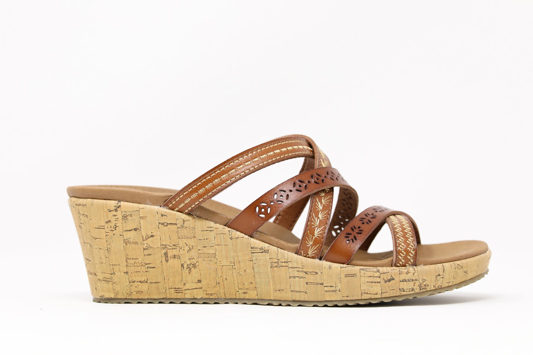 • Cork veneer wedge heeled fashion strappy slide sandal design
