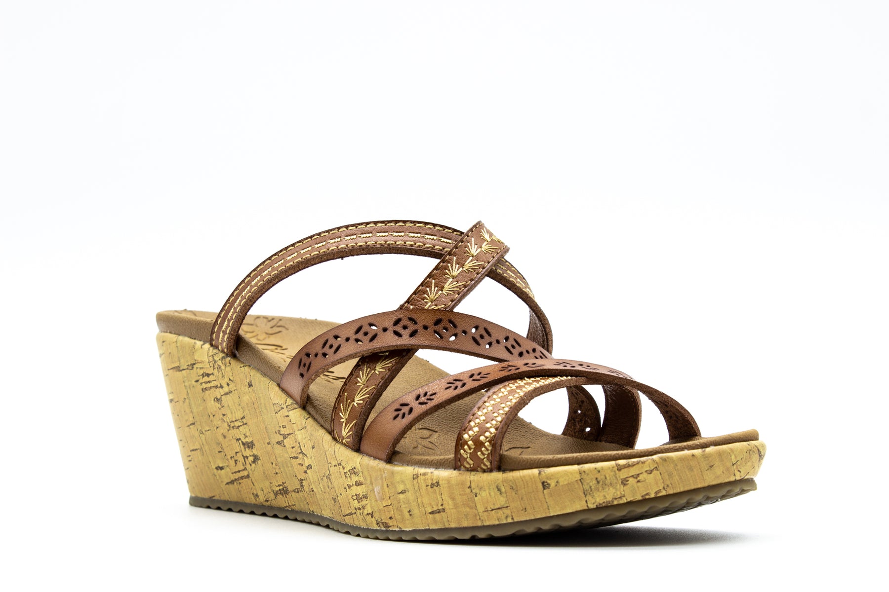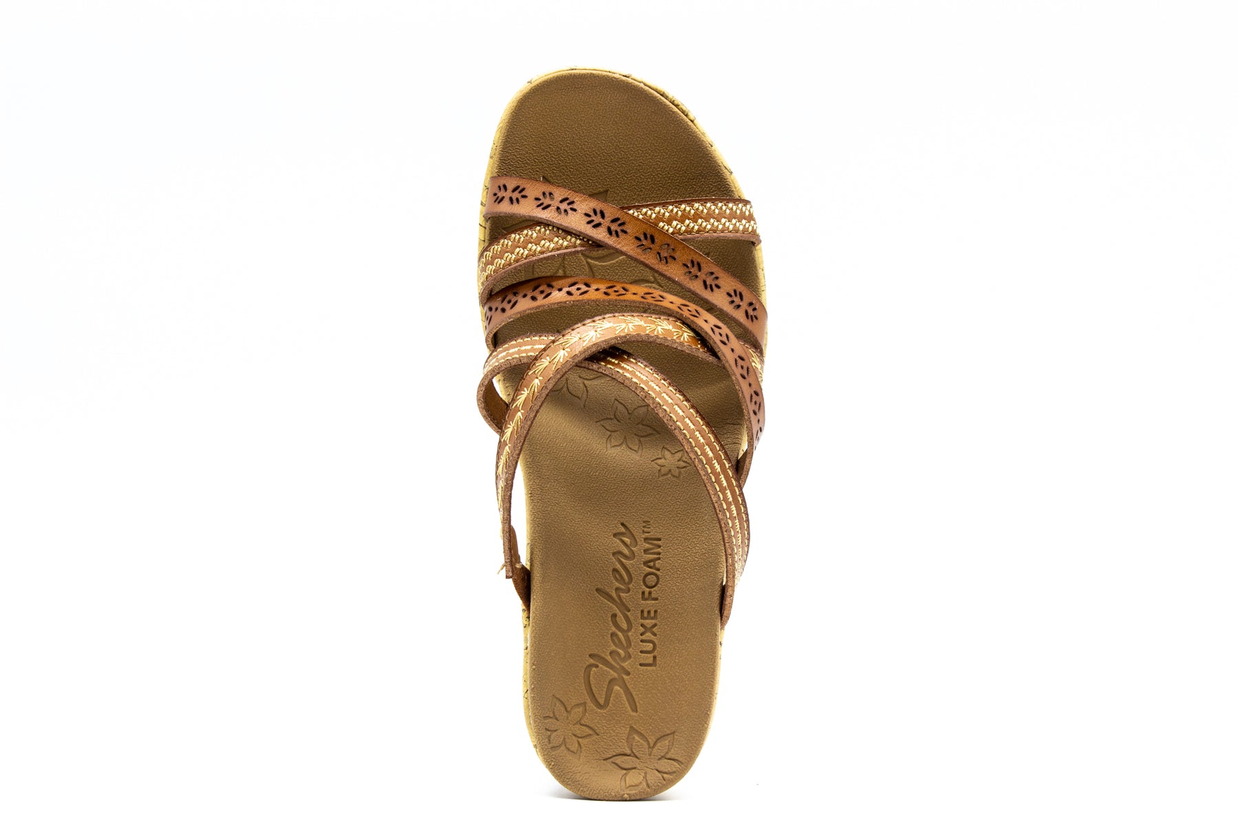 Bring the fierce style with you everywhere wearing the SKECHERS Cali Beverlee - Tiger Posse sandal. Embroidered synthetic upper in a wedge heeled fashion strappy slide sandal with cork wedge heel and Luxe Foam footbed.