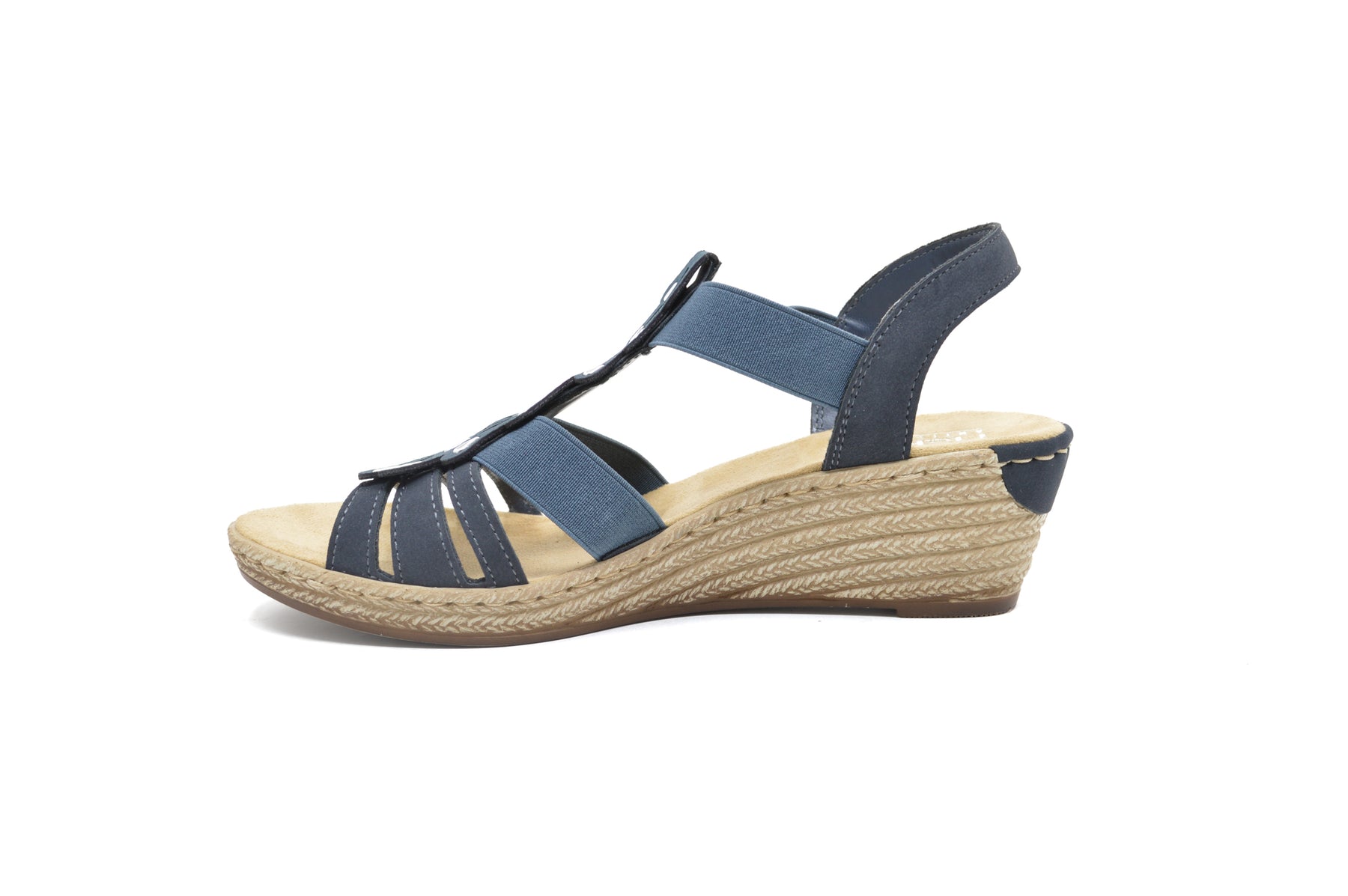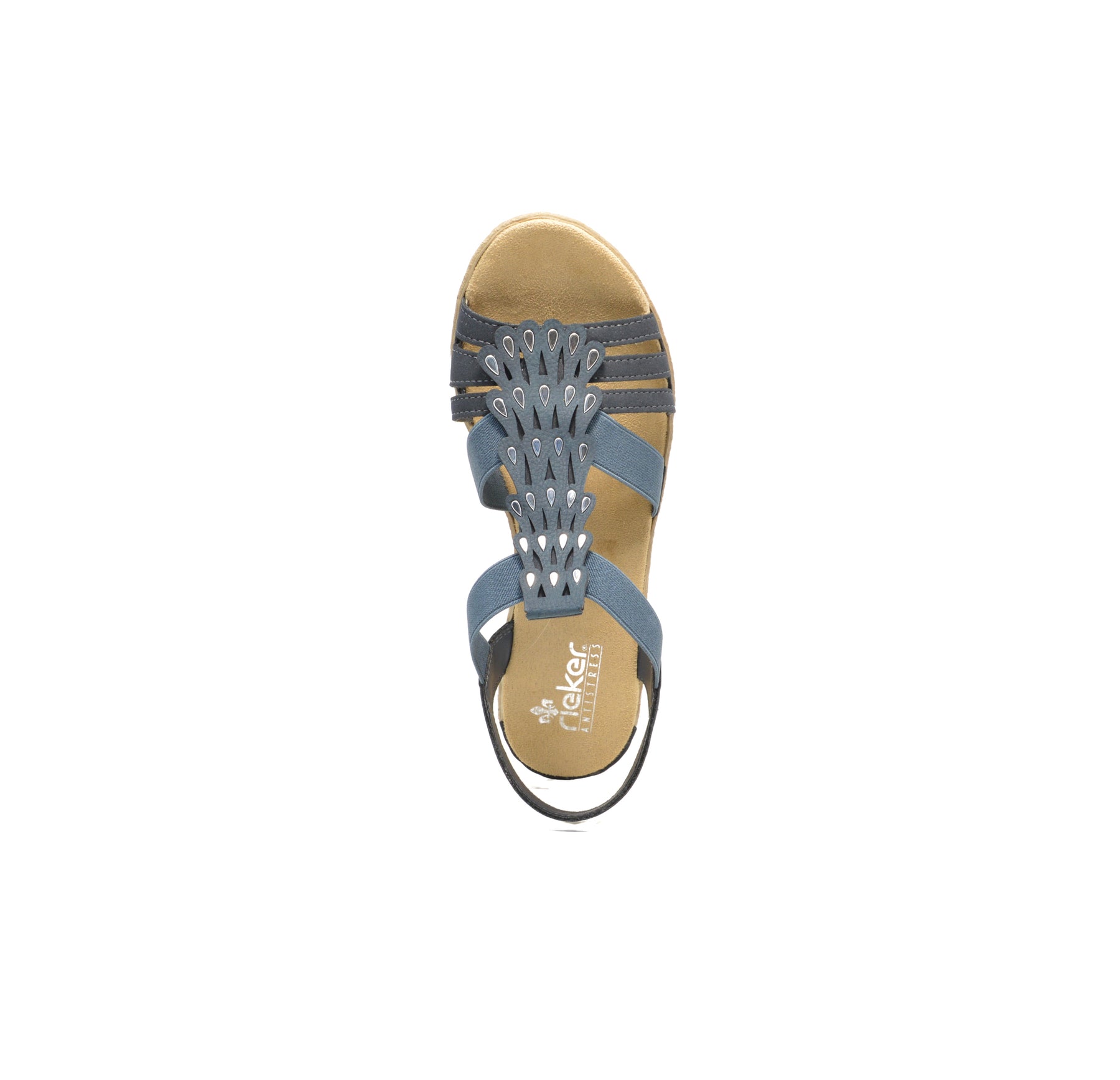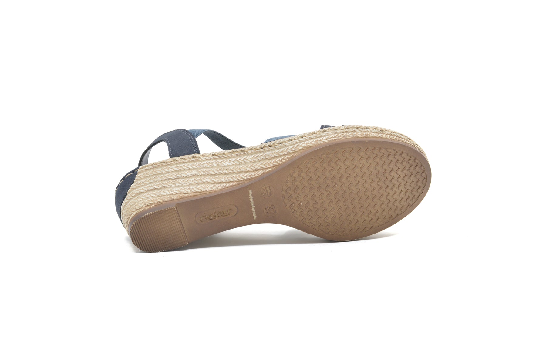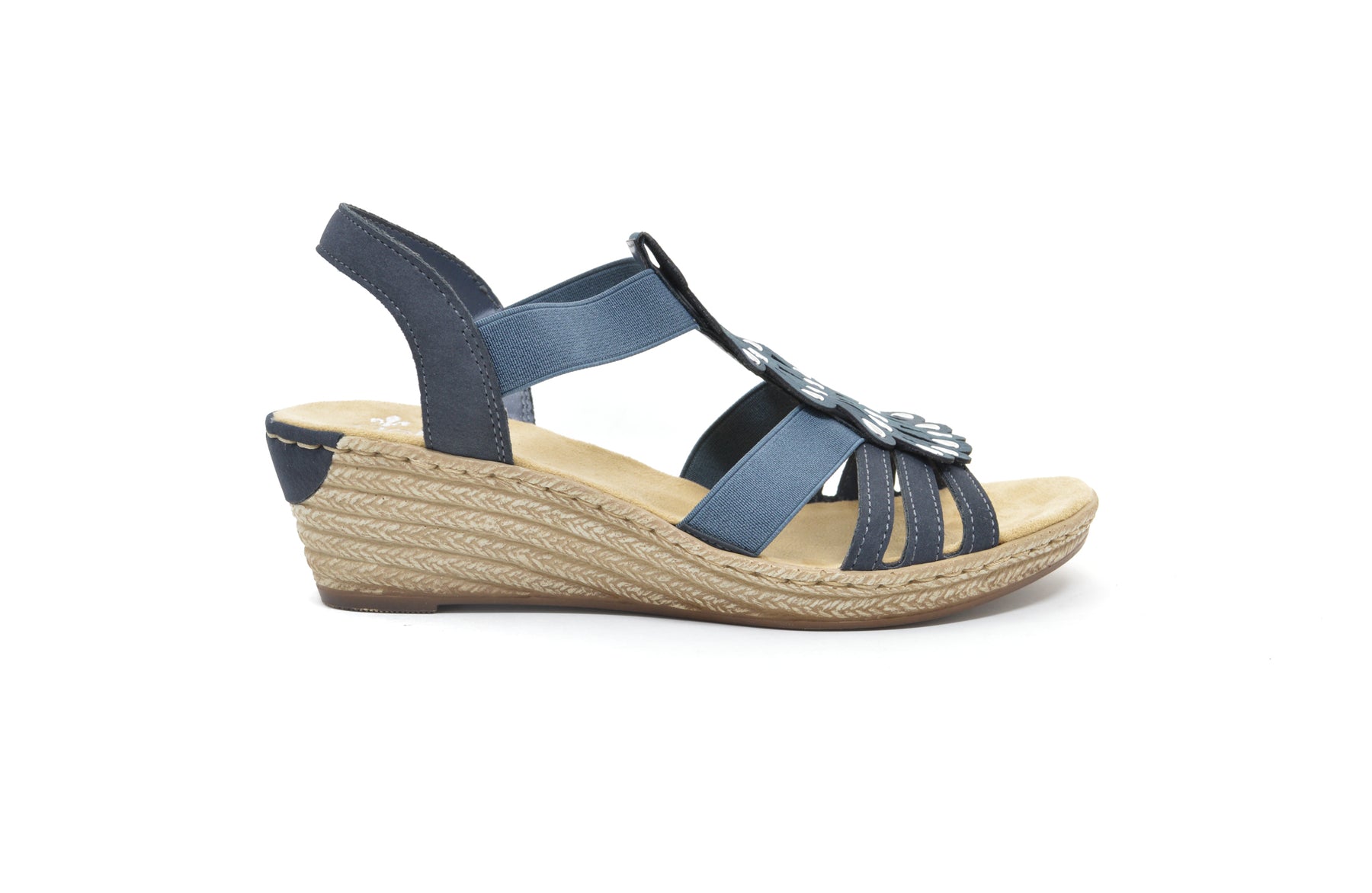 Rieker 62436-14 women's comfortable strappy wedge sandals with silver stone detail - light weight and flexible roomy sandals in navy. Comfortable and trendy, Rieker Antistress sandals 62436-14 Fanni feature 55mm raffia effect low wedge sole unit and soft textile insole for added comfort in hot days. With two elasticated straps Rieker Antistress sandals are known for their roomy fitting, light weight construction and flexible sole