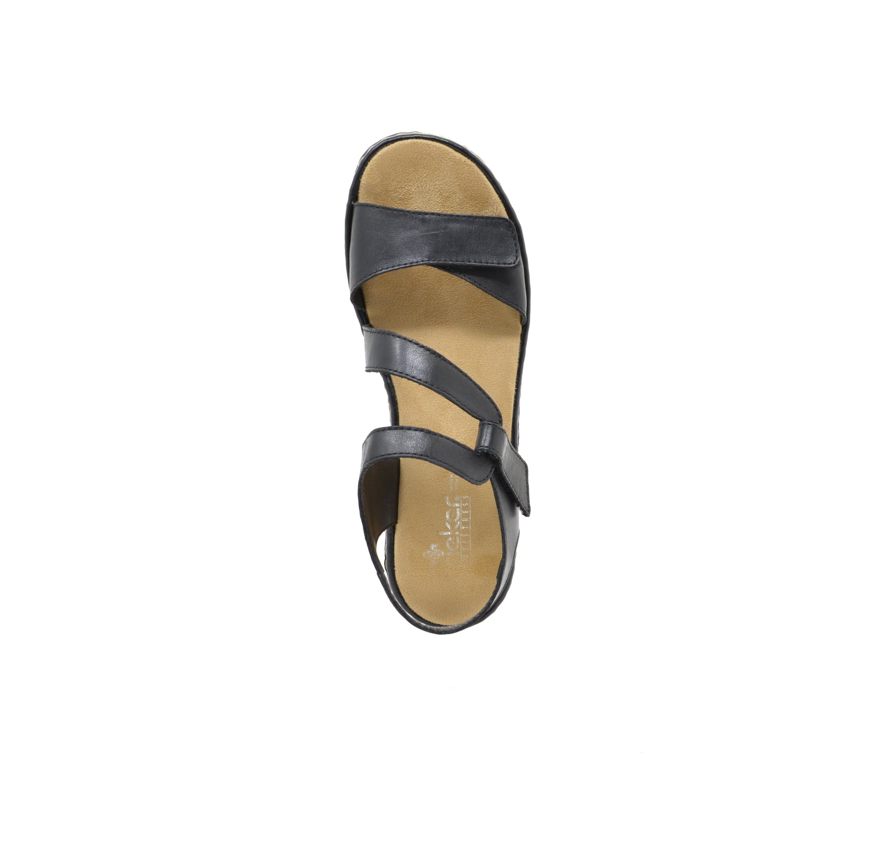 Black ladies’ low sandals with two hook and loop fastening straps.
