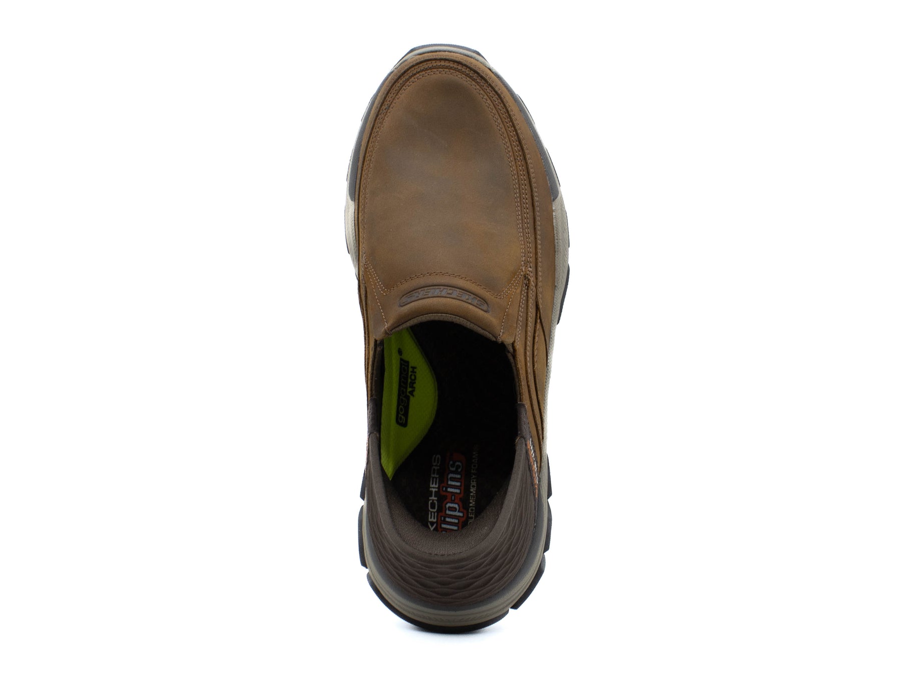Simply step in and go wearing Skechers Hands Free Slip-ins® Relaxed Fit®: Respected - Elgin. Designed with our exclusive Heel Pillow™, this roomy moc toe style features a leather upper with a TOUCHLESS FIT® Skechers Slip-ins® molded heel panel, a comfort arch insole, and Goodyear® Rubber Outsole.