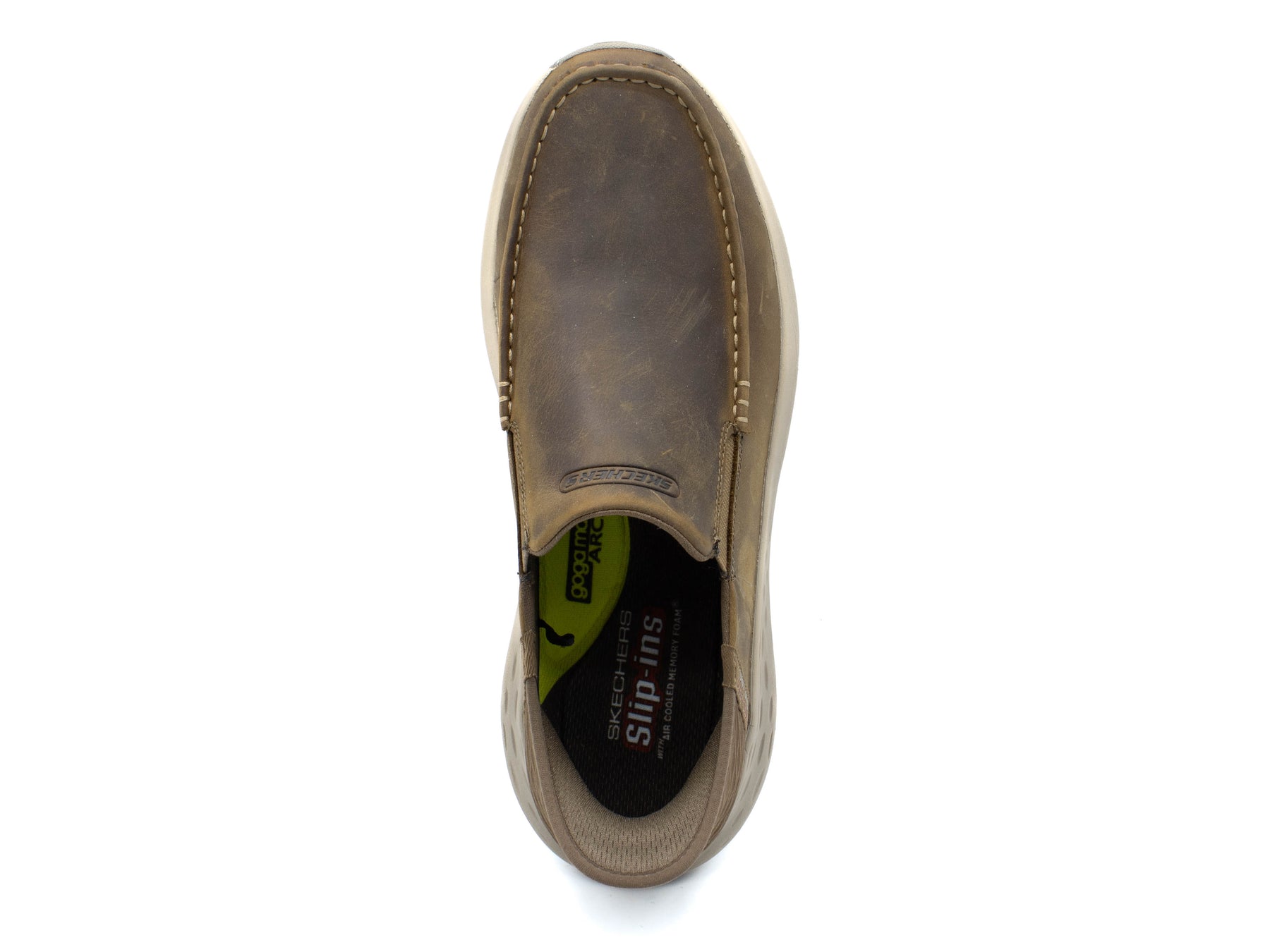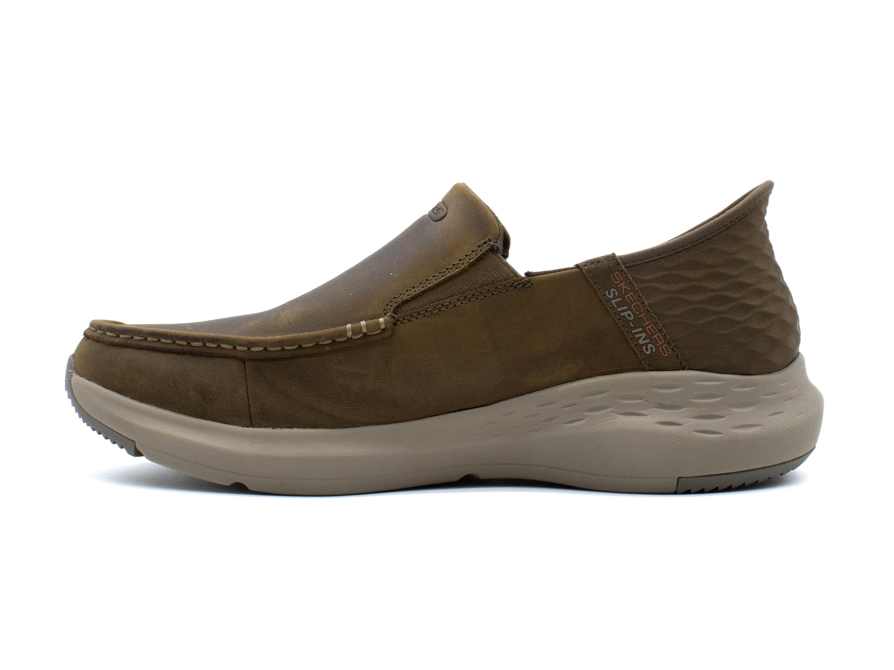Step into easy-wearing comfort and classic style with Skechers Hands Free Slip-ins® Relaxed Fit®: Parson - Oswin. Designed with an exclusive Heel Pillow™, this laceless fit moc toe style features a Skechers Slip-ins® molded heel panel, leather upper, Skechers Air-Cooled Memory Foam® insole, and Goga Mat Arch™ cushioning for added support.