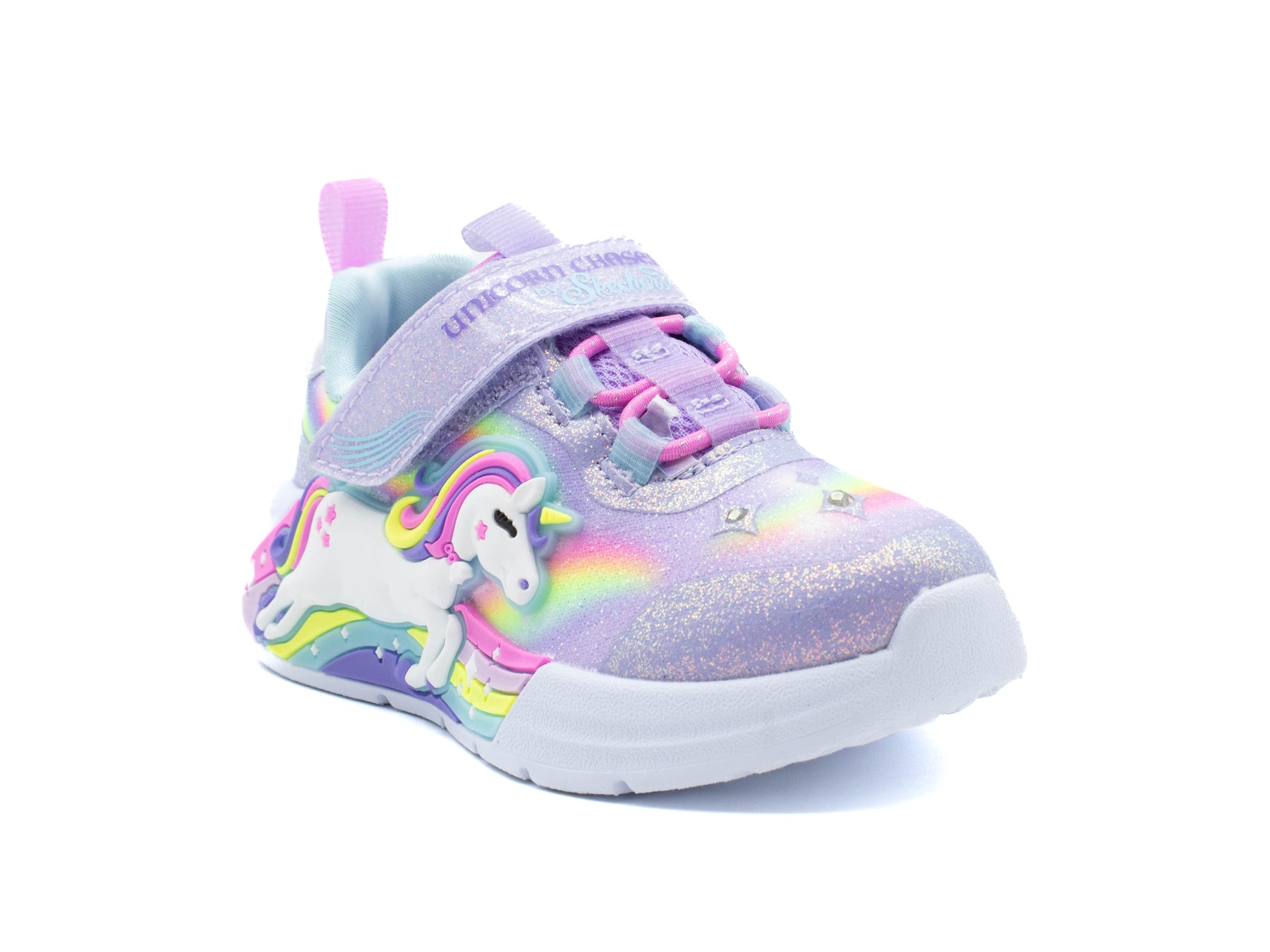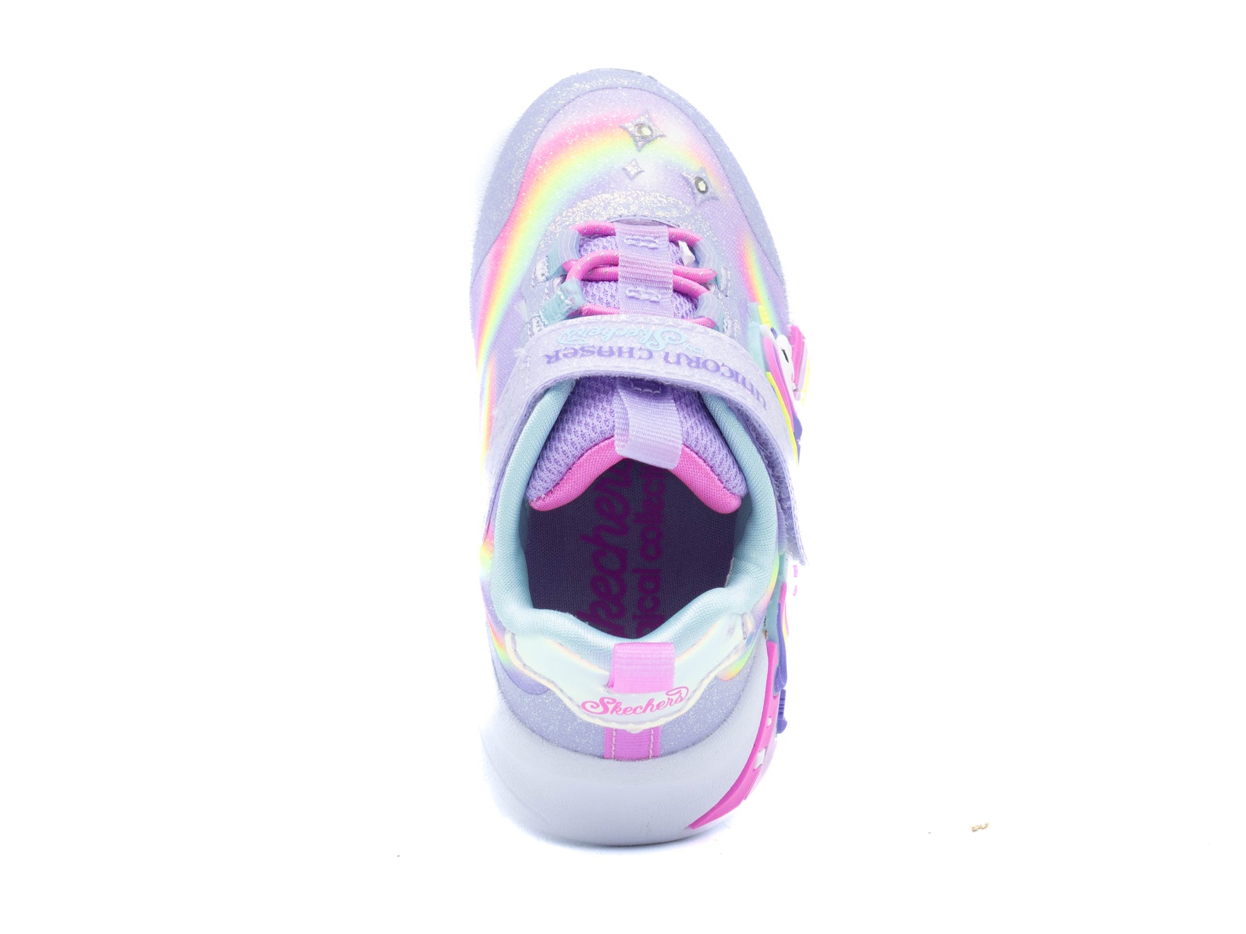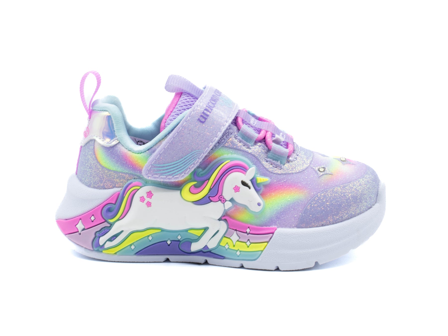 Sparkle and shine in style wearing Skechers S-Lights® Unicorn Chaser. This sporty Magical Collection® lighted design features a synthetic glitter finish upper with unicorn and rainbow side graphic, stretch laces, adjustable instep strap, and a cushioned comfort footbed. Bonus gift with purchase.