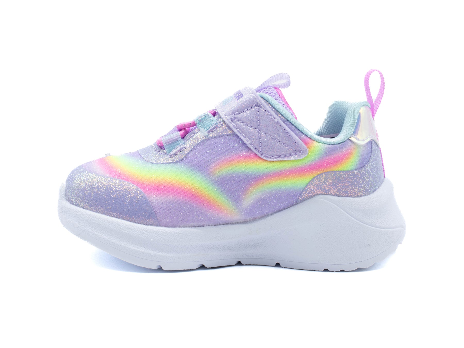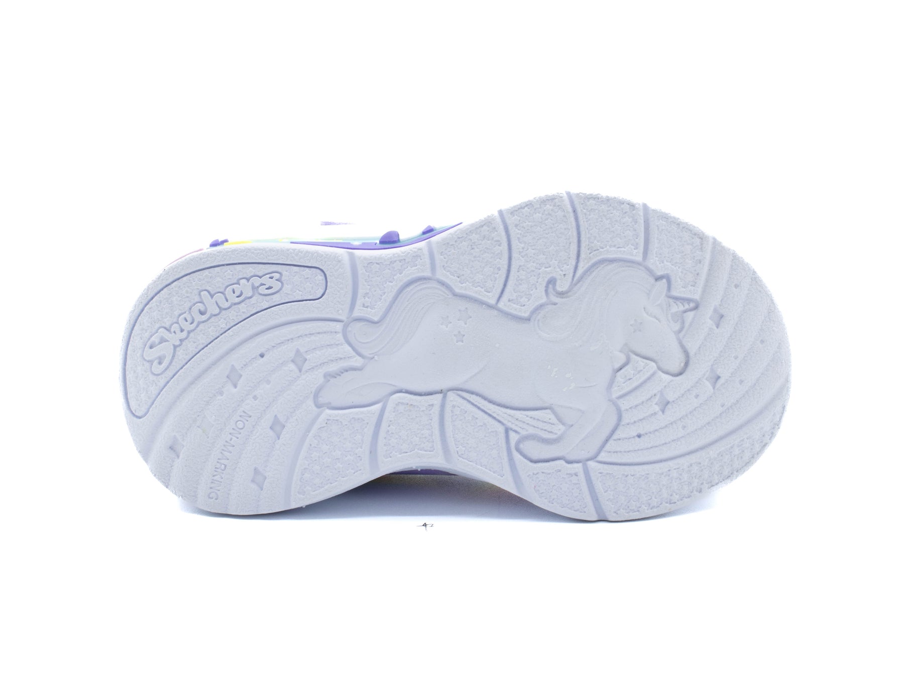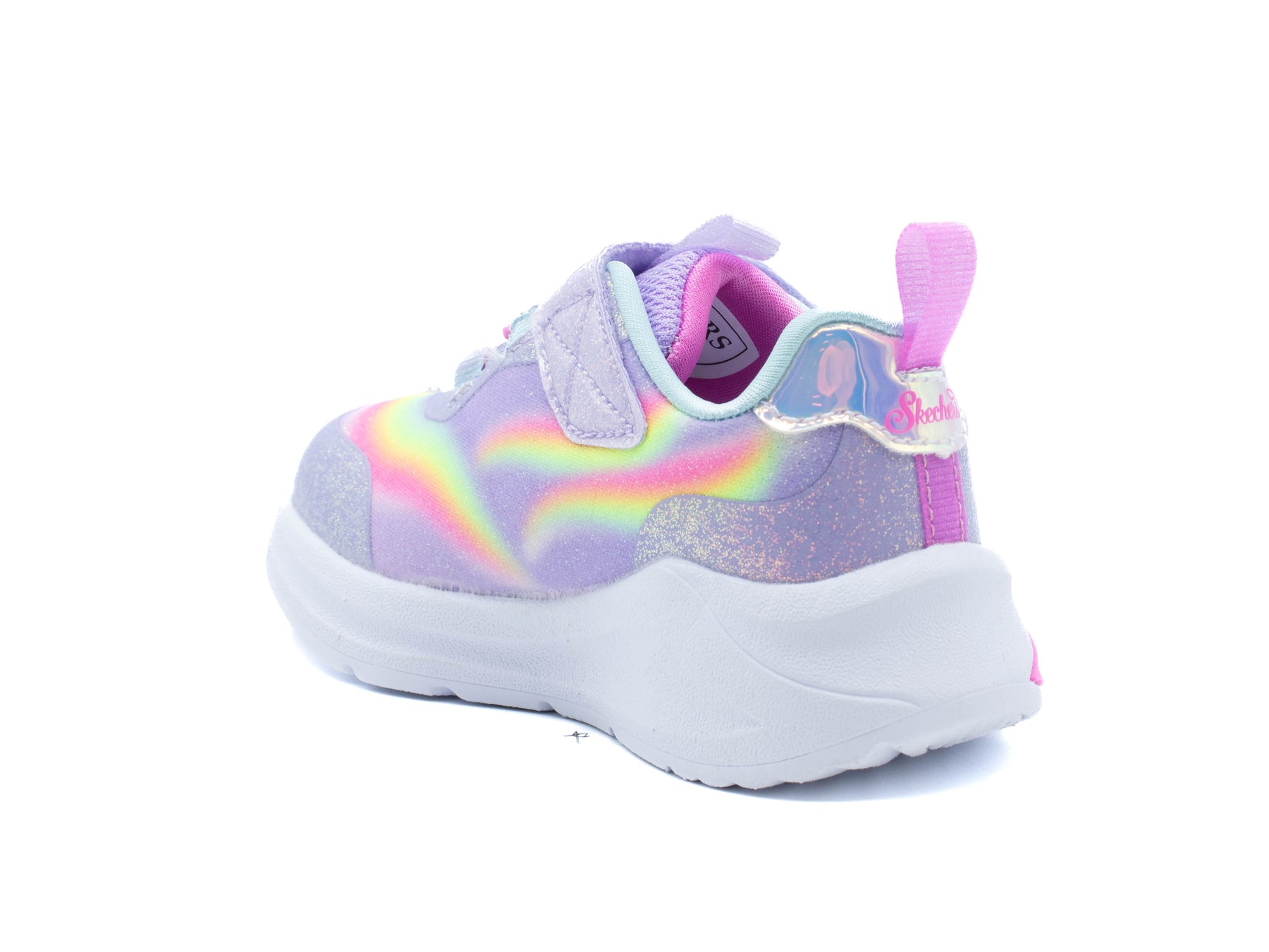 Sparkle and shine in style wearing Skechers S-Lights® Unicorn Chaser. This sporty Magical Collection® lighted design features a synthetic glitter finish upper with unicorn and rainbow side graphic, stretch laces, adjustable instep strap, and a cushioned comfort footbed. Bonus gift with purchase.